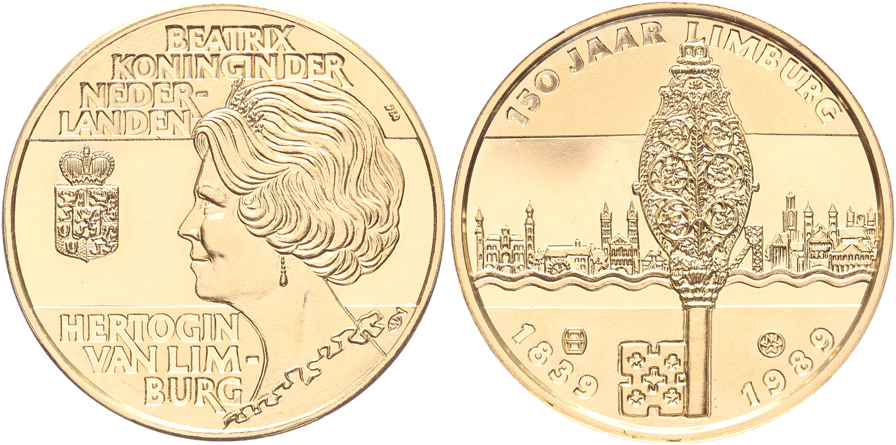 1989 150 Jaar Limburg. Portret Beatrix als hertogin van Limburg naar links. / Sleutel van St. Servaas met de Maas en stadsgezicht. AU 22 [6,72 gram, 750/1000]. Willem Vis. FDC.