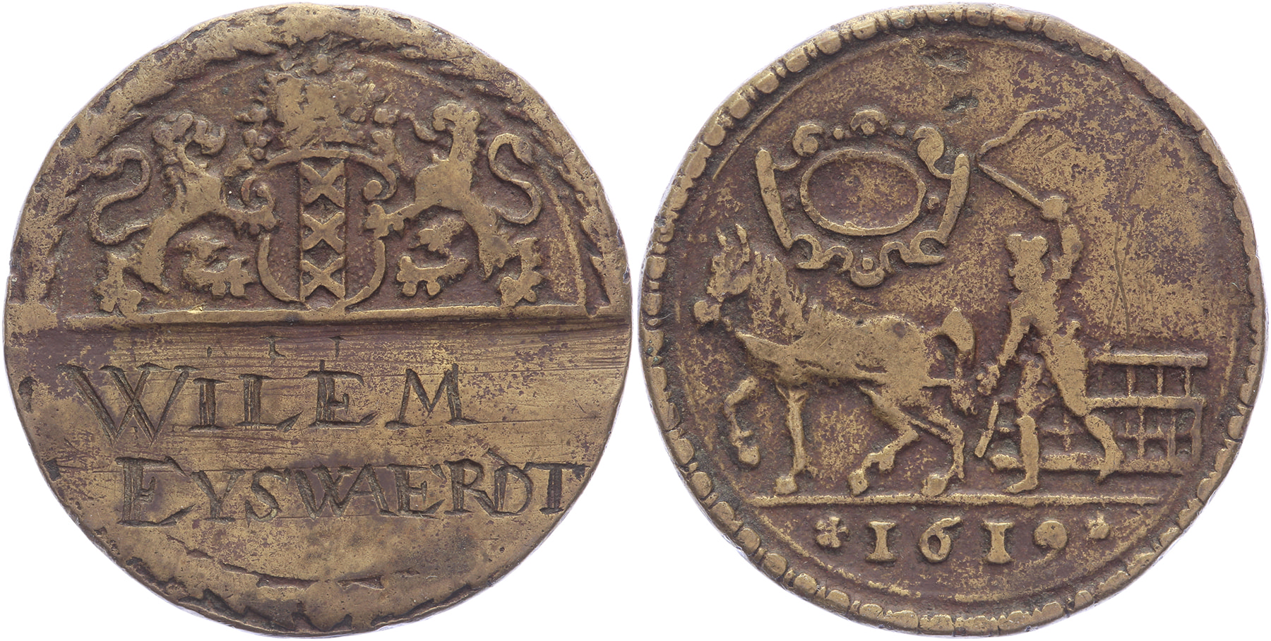 1619 Slepers. Sleper met paard en sleep boven 1619. / Wapen van Amsterdam. Op naam van Willem Eyswaerdt. Messing gegoten 30,8. WK 4.1. Fraai / Zeer fraai.
