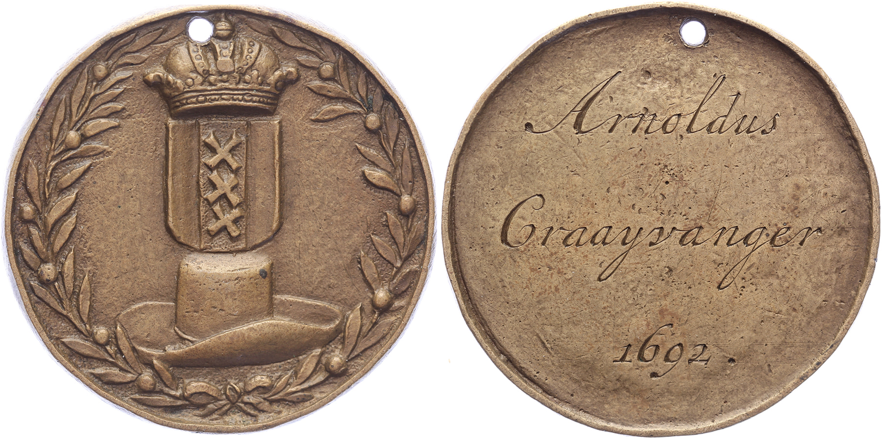 1692 Hoedemakers. Wapen van Amsterdam boven een hoed. / Gegraveerd: Arnoldus Craayvanger + jaartal. Messing gegoten 49. Met pengat. WK 9.3. Zeer fraai.