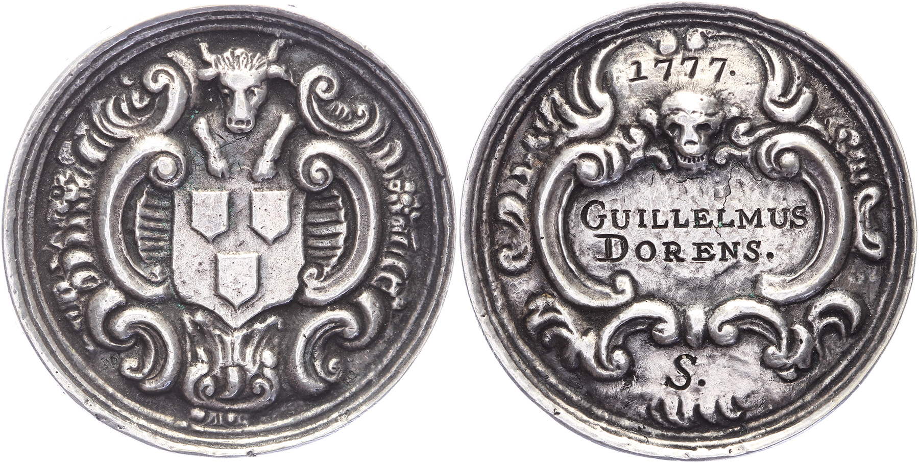 1777 Overmanspenning Schilders of St. Lucas. Ossenkop boven St. Lucasschild. / Schild met gegraveerde naam: Guillelmus Dorens. AR gegoten 41,7 [28,72 gr.]. WK 12.3. Zeer fraai.