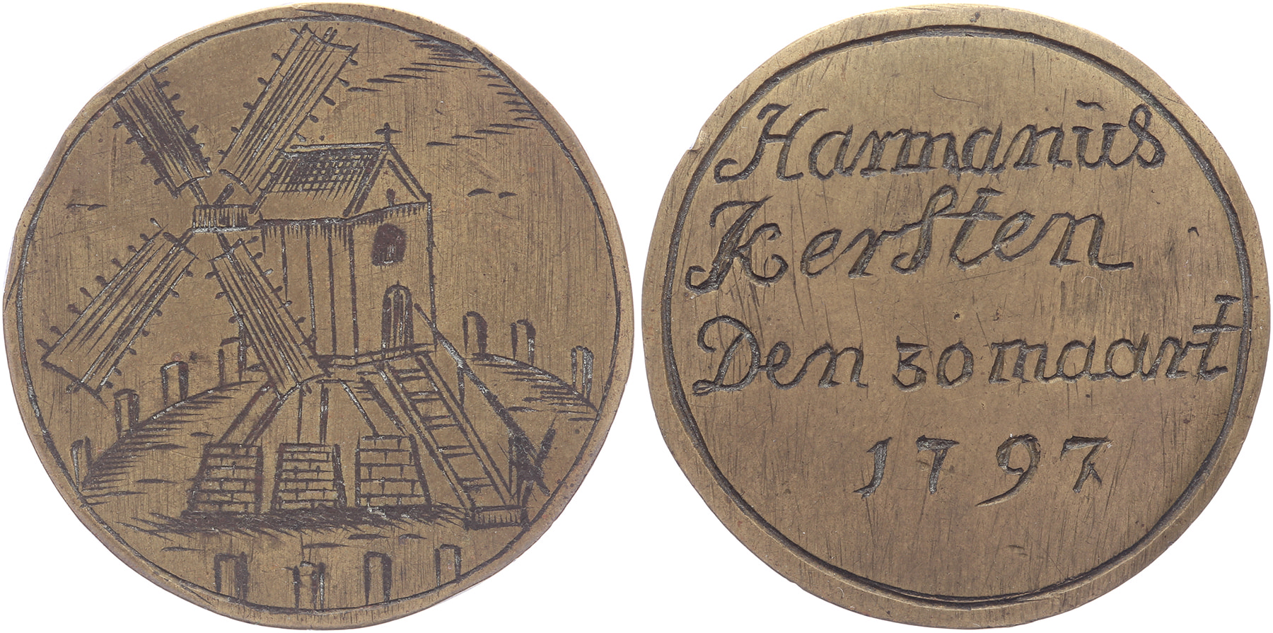 1797 Korenmolenaars. Molen naar rechts tussen paaltjes. / Op naam van: Harmanius Kersten. Messing 33,8. WK 29.1; Dirks V-49. Zeer fraai.