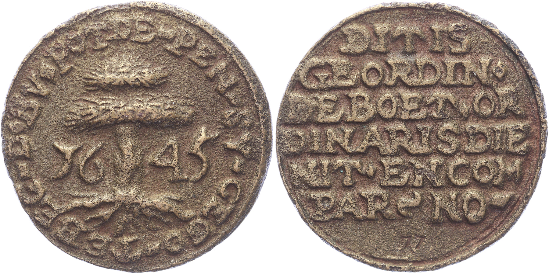 1645 Buurtpenning Lange- of Willige Poten. Boom met dubbele kruin tussen jaartal. / Zesregelig opschrift boven ingeslagen nr. 77.Messing gegoten 50,3. RBN 1859.9; Minard 199; vRem. 12. Bijna zeer fraai.