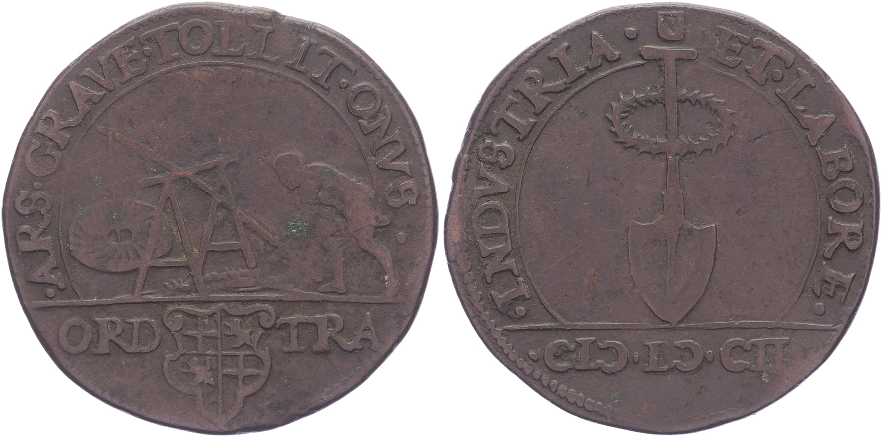 1602 Inname van Grave door Maurits. Man lift molensteen via dommekracht. / Verticale spade met lauwerkrans. Æ31,5. Dugn. 3535; vL I-567.3; Tas 356. Vrijwel zeer fraai.