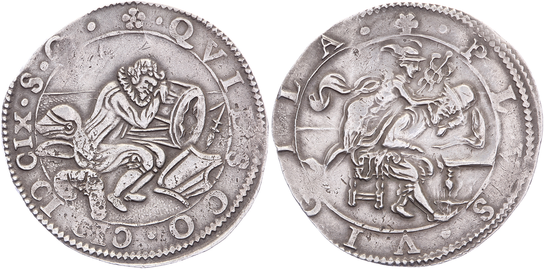 1609 Aansporing tot waakzaamheid tijdens het 12-jarig bestand. Slapende Nederlander tussen afgelegde wapenen. / Mercurius maakt hem wakker.AR 29,9 [7,46 gr.]. Dugn. 3651; vL II-56; Tas 410. Zeer fraai. ⁂