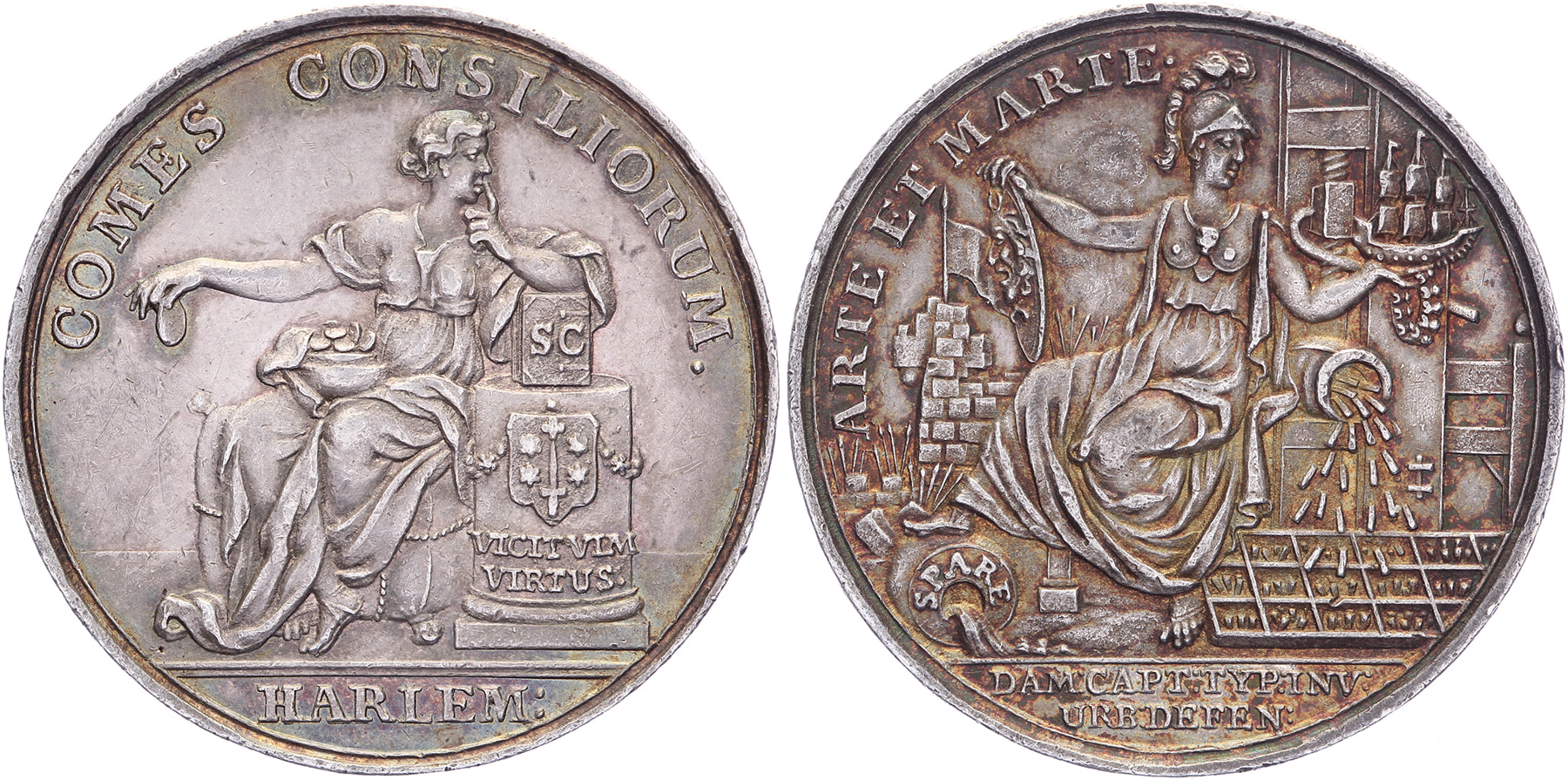 (± 1740) Zittende stedenmaagd bij zuil. / Zittende stedenmaagd tussen oorlog en vrede attributen. AR 32 [13,15 gram]. VvL I -149. Bijna prachtig.
