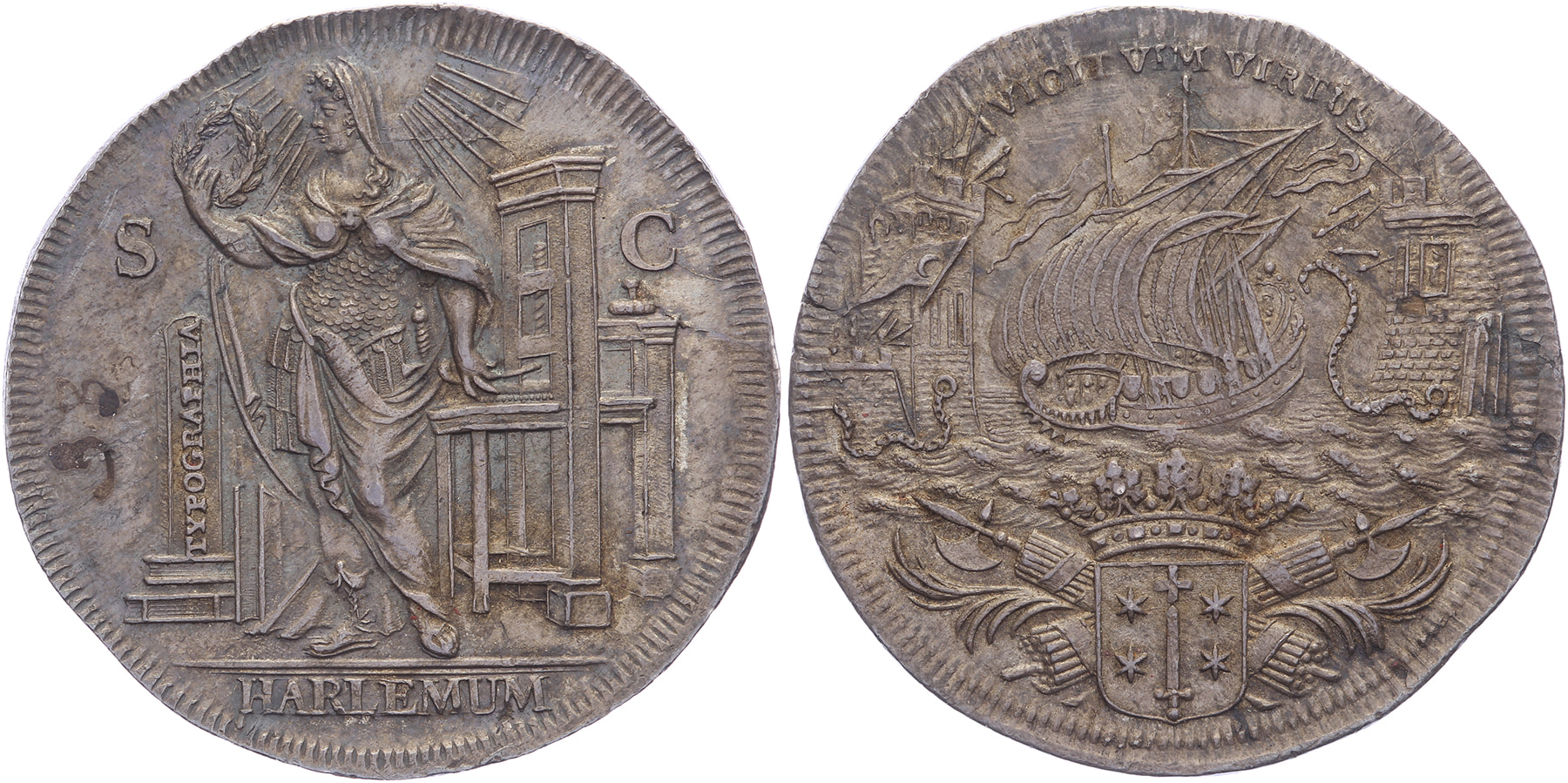 (ca. 1750) Staande stadsgodin met lauwerkrans leunend op drukpers. / Schip vaart ketting aan stukken (inname Damiate). AR 33.5. vL I-160.2. Prachtig.