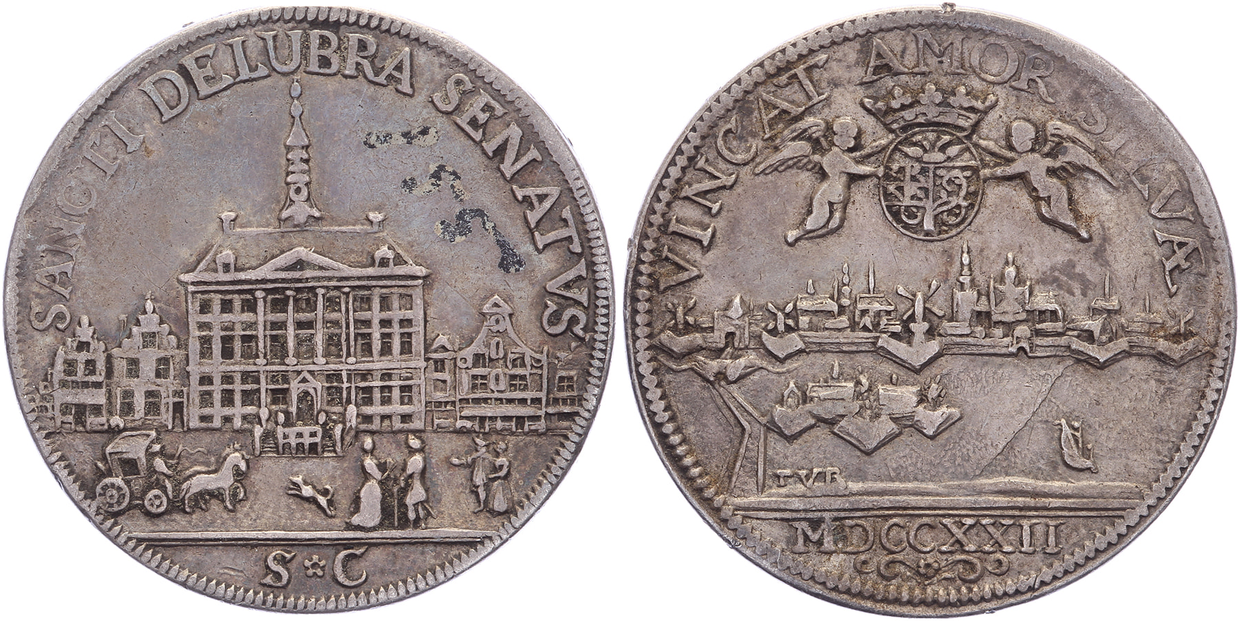 1722 Gezicht op het stadhuis. / Gezicht op de stad in vogelvlucht.AR 22,4. VvL 40; Snoeck 30. Theo van Berckel. Zeer fraai.