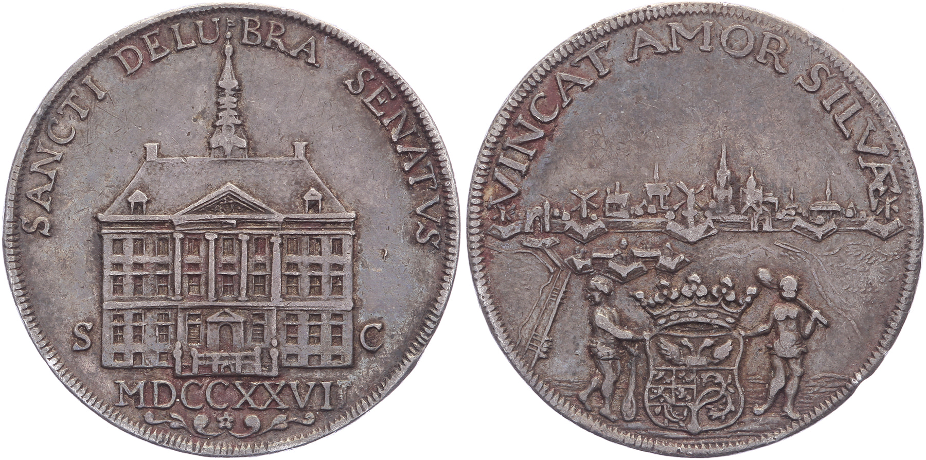 1727 Stadhuis boven jaartal met lofwerk. / Gezicht op de stad boven wapen gehouden door twee wildemannen. AR 22,6. Snoeck 41. (Theo van Berckel). Zeer fraai.