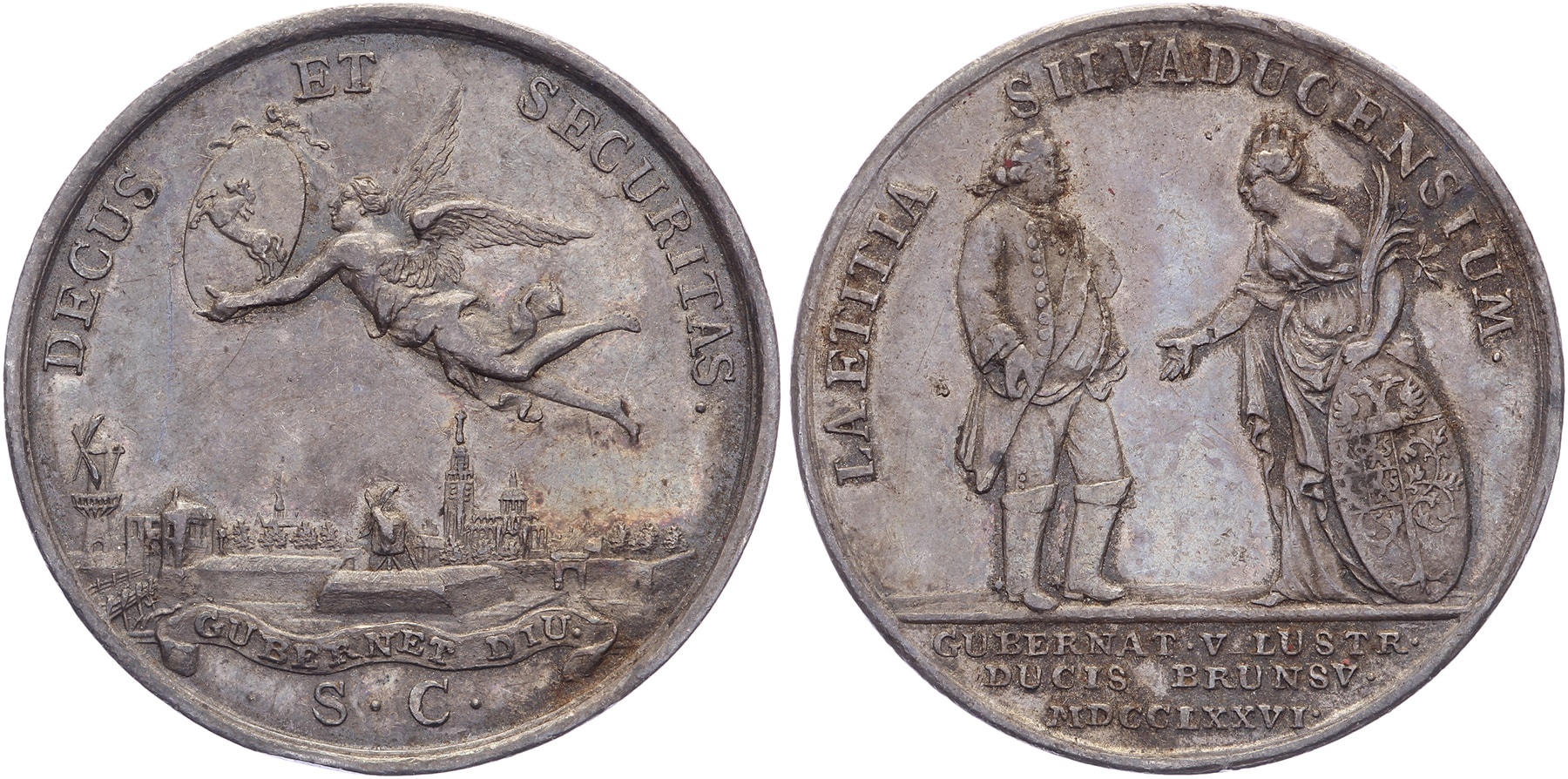 1776 Op de hertog van Braunschweig-Wolfenbüttel. Stadsgezicht onder vliegende engel. / Staande stadsmaagd en hertog. AR 27,5. VvL 508; Snoeck 79. (Theo van Berckel). Zeer fraai.