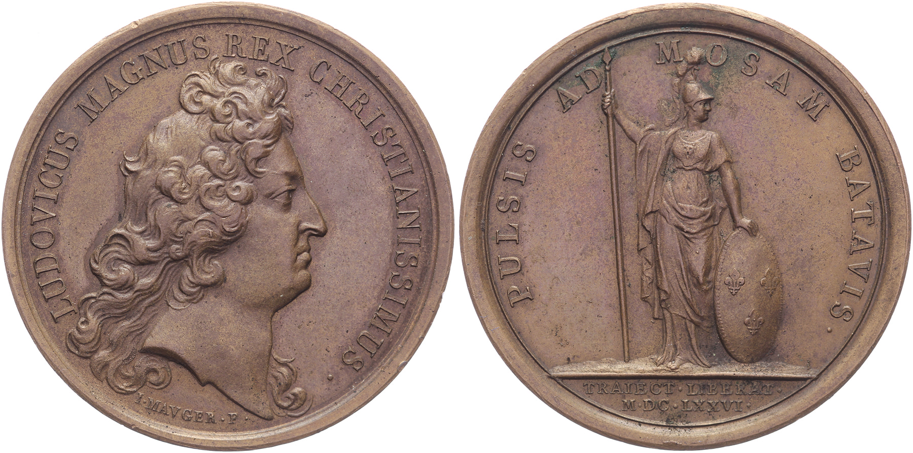 1676 Opheffing beleg van Maastricht. Hoofd Lodewijk XIV naar rechts. / Staande Pallas met schild en lans. Æ 41,1. Divo 157. Later werk. I. Mauger. Prachtig.