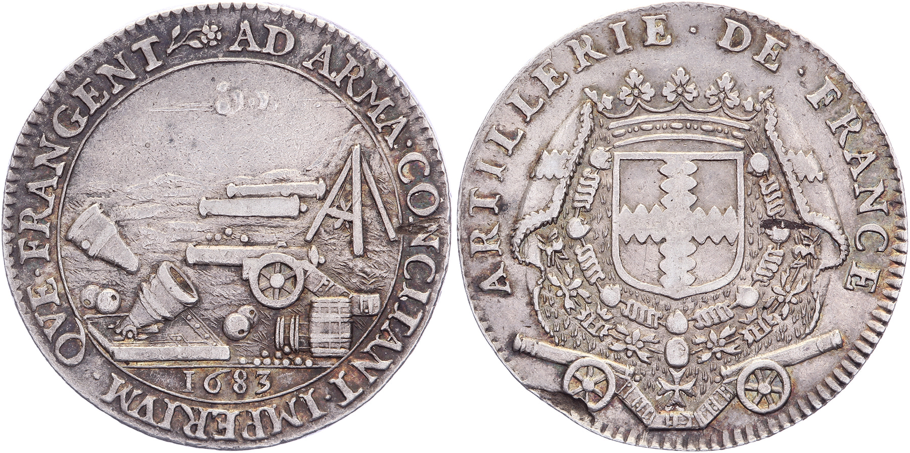 1683 Henry de Daillon, luitenant-generaal van de Artillerie Royale van Lodewijk XIV bij het beleg van Maastricht. Allerlei oorlogswapens gebruikt tijdens het beleg. / Versierd wapenschild rustend op twee kanonnen. AR 26,8 [7,15 gr.]. Feuardent 983. Schaars. Prachtig.