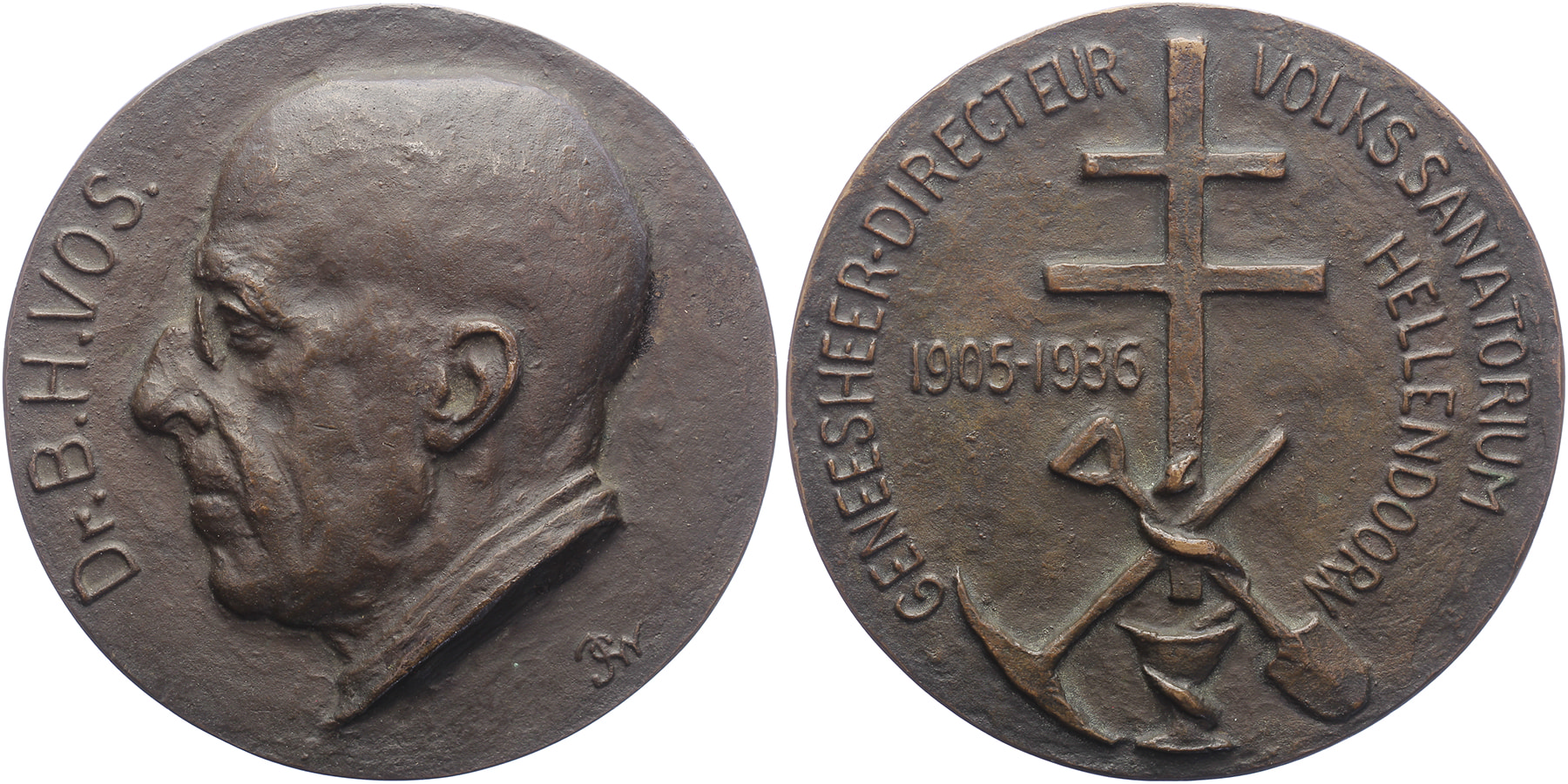 1936 Afscheid geneesheer-directeur Vos van Volkssanatorium Hellendoorn. Hoofd Vos naar links. / Lotharings kruis boven vijzel, æsculaap en gekruiste schop en houweel. Æ gegoten 98. Polak 84. J.G. Wertheim. Prachtig.