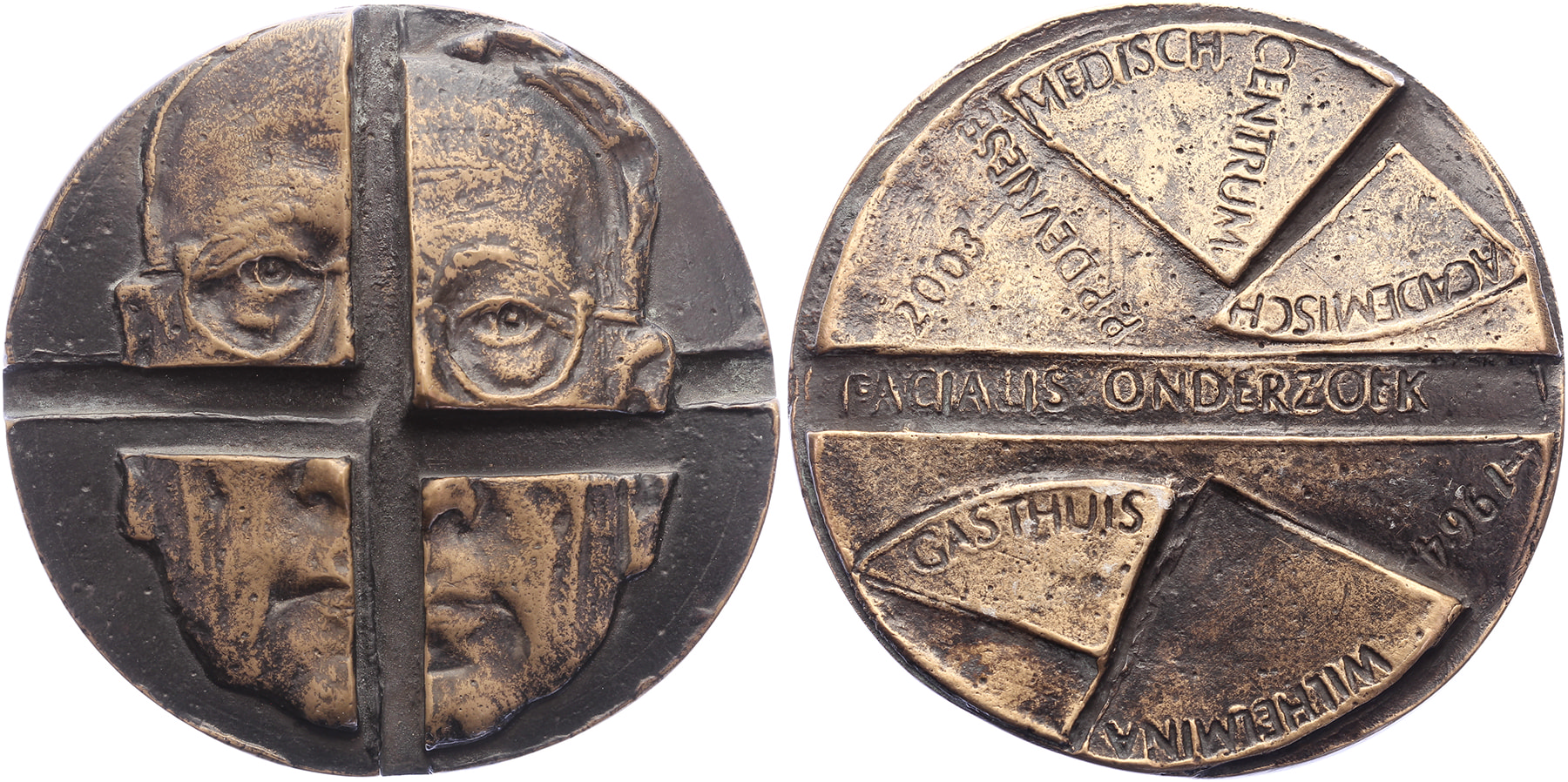 2003 Facialis onderzoek. Portret en face in vier segmenten. / Tekst AMC en Wilhelmina Gasthuis.Æ gegoten 90. De Beeldenaar 2008, pag. 263, nr. 298-variant. (Eric Claus). Prachtig.