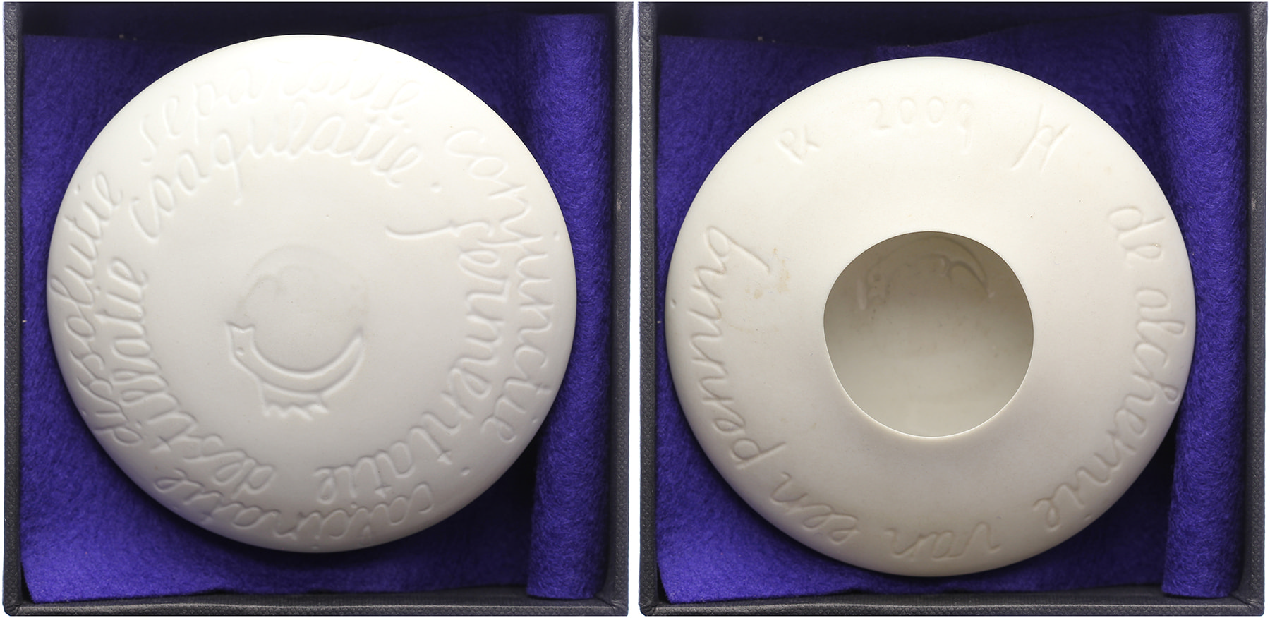 2009 Alchemie van een penning. Allerlei begrippen samenhangend met alchemie. Porselein 85, bolvormig en zéér breekbaar. Pauline Hoeboer. Prachtig.