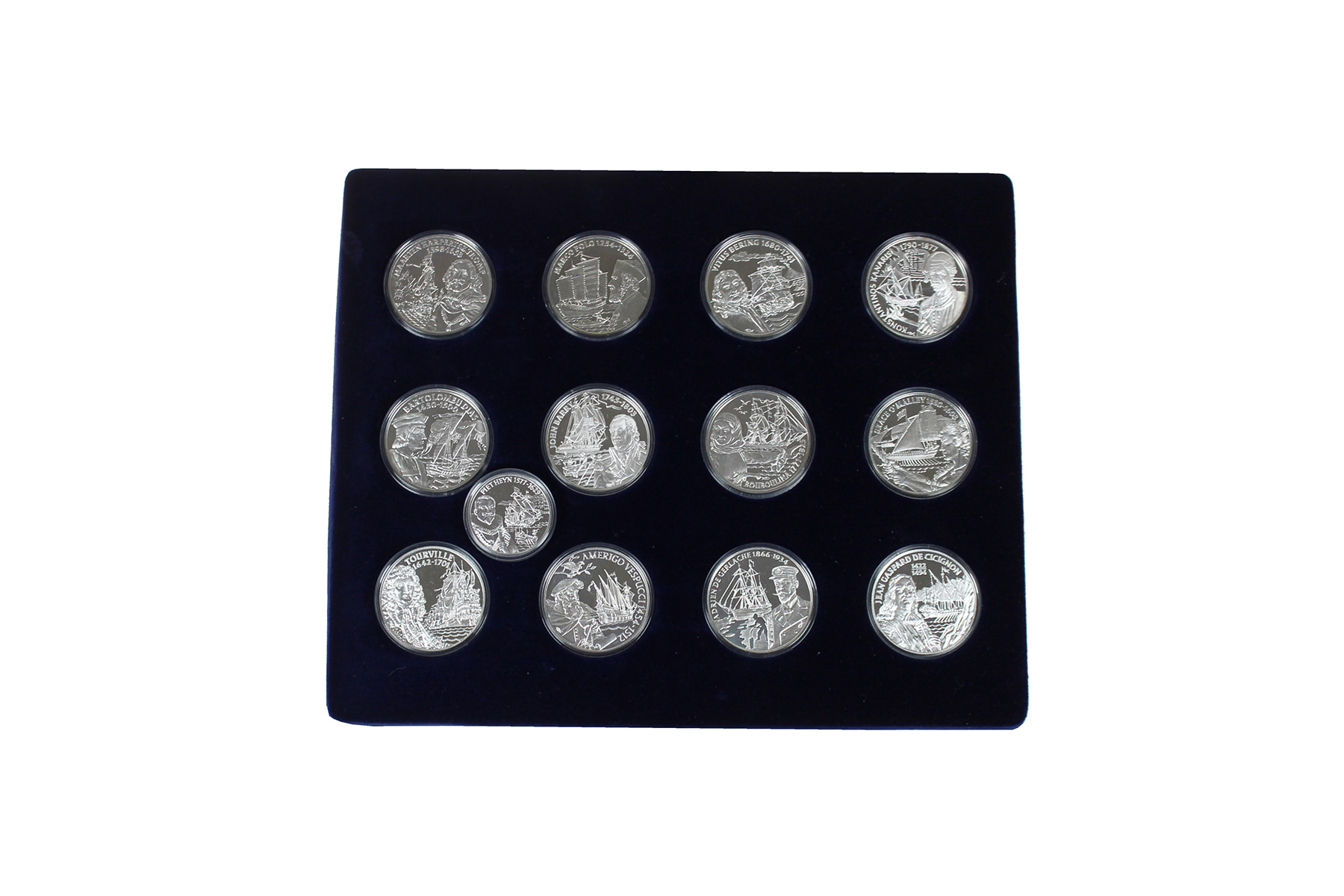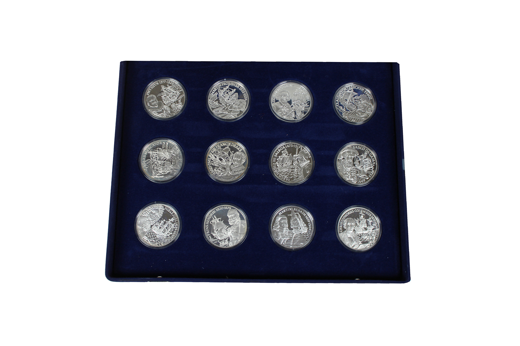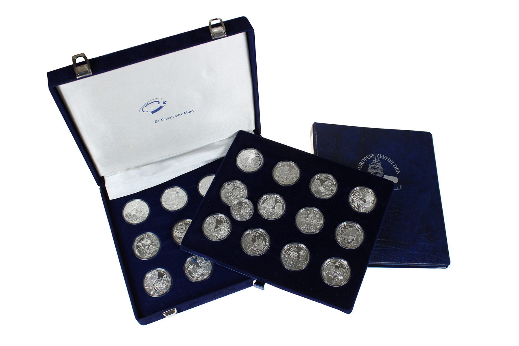 Blauwe cassette met 25 sterling zilveren penningen met evenzoveel ‘zeehelden’, met certificaten van echtheid! Netto ca. 565 gram.
