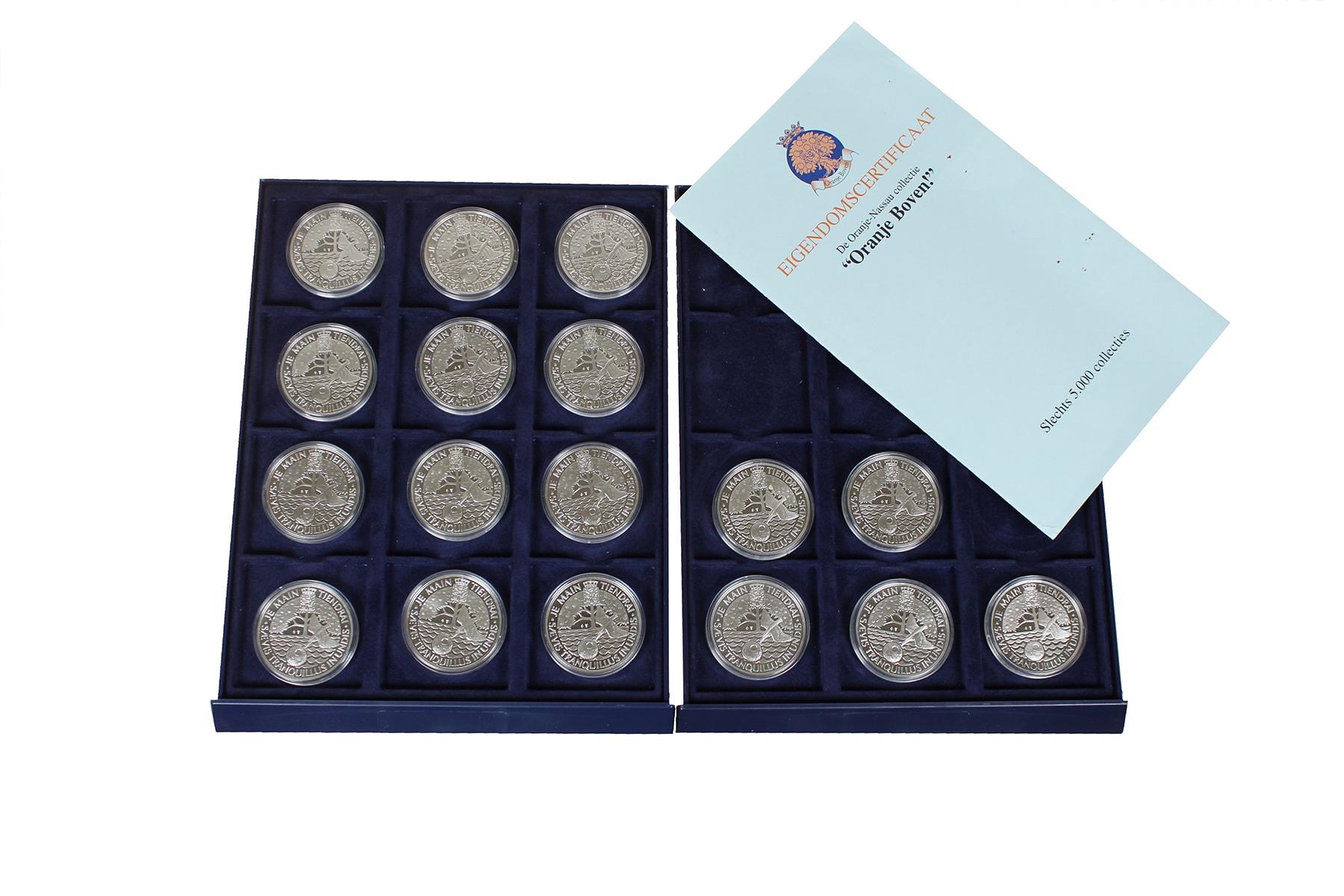 Twee blauwe cassettes met 17 sterlingzilveren penningen “Oranje Boven”. Netto zilver: 393 gram.