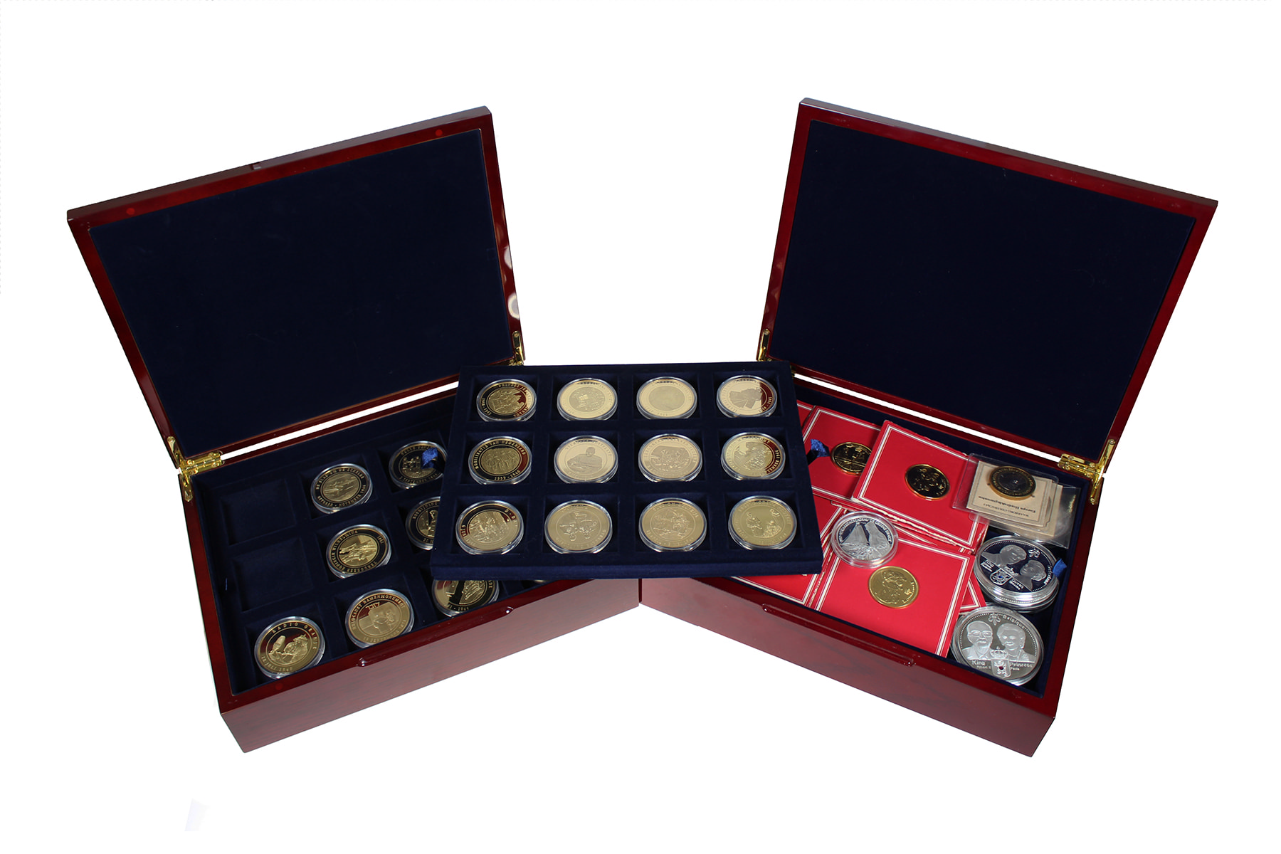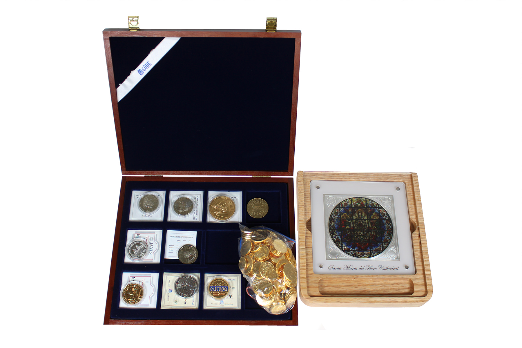 Groot kavel penningen van het hoogste bling-bling-gehalte (ca. 100 stuks), “zwaar verguld en/of verzilverd. Inclusief informatie. De houten dozen (5x) zijn wel mooi. Toegevoegd: zakje vergulde euromunten, ook ca. 100 stuks. Goedkoop etalagemateriaal!
