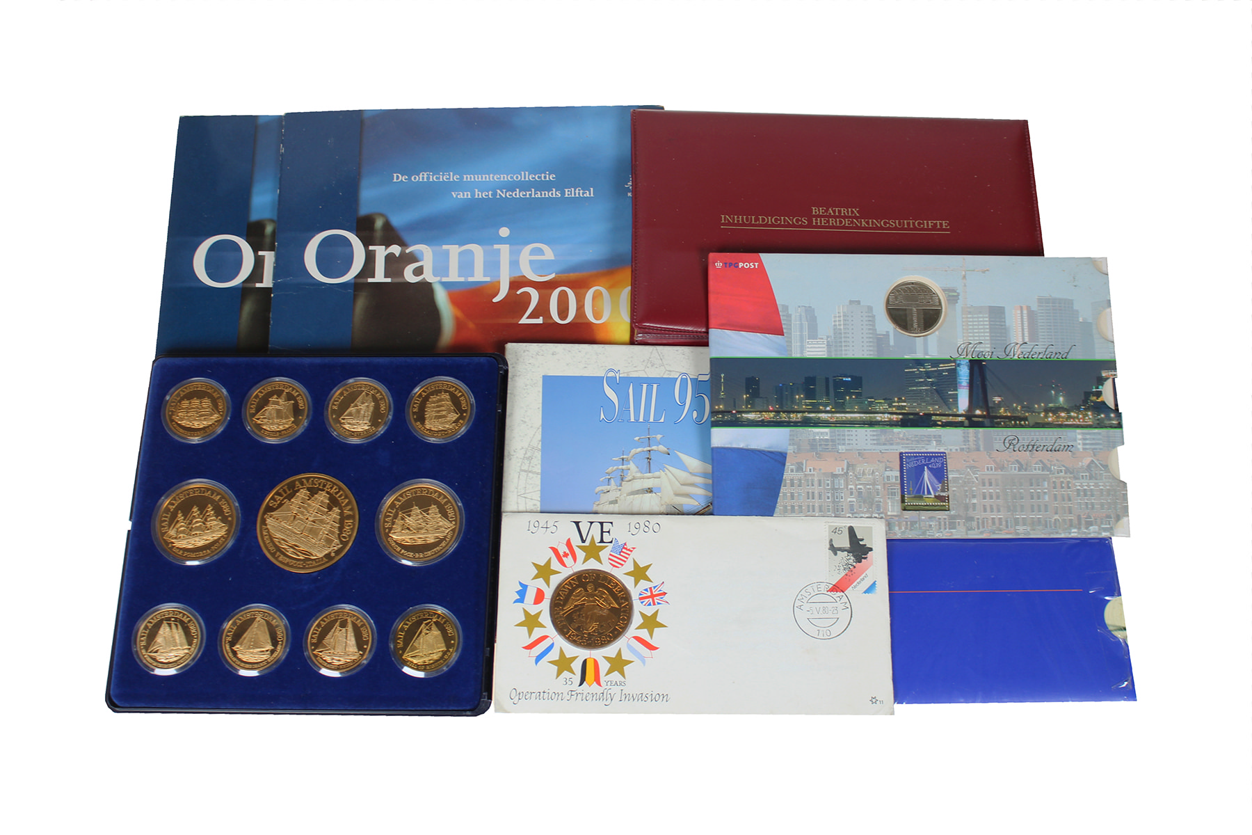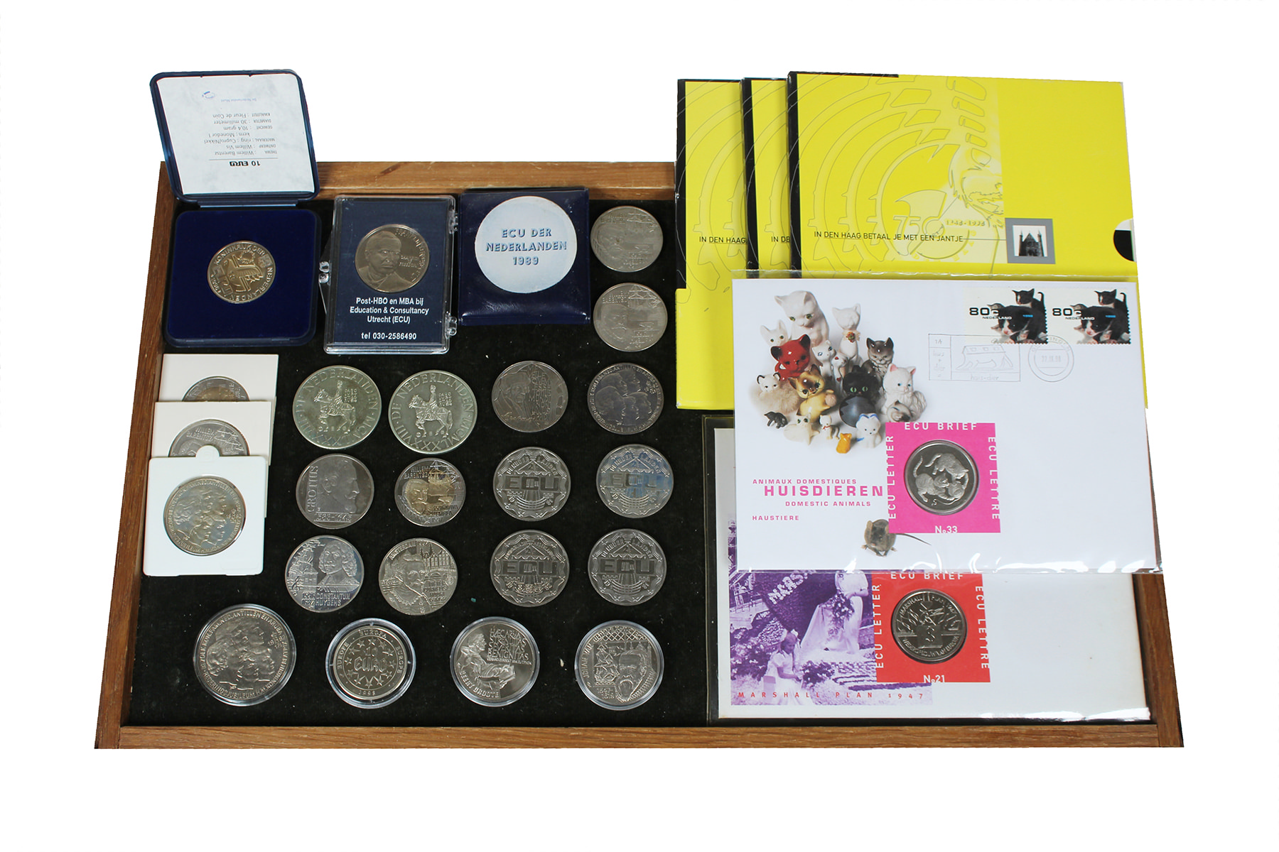 Schoenendoos penningsets; o.a. Oranje 2000, Haagsche Jantjes, Sail 1980 (mooie schepen), etc. Tevens een zakje met Ecu/Euro-penningen.