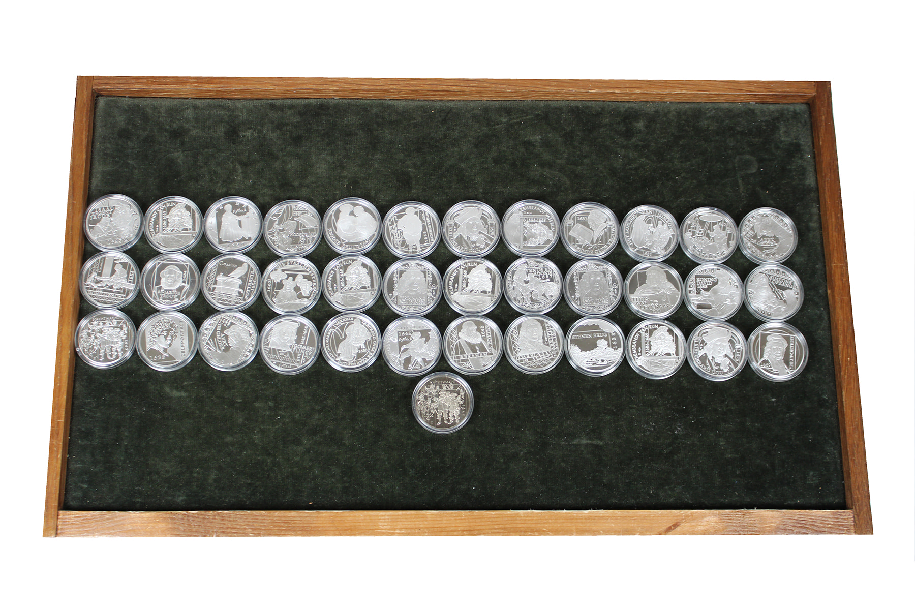 Rood Agio-blik met 35 Rembrandt penningen, 35 x zilver; 1 x nikkel. Netto 265 gram zilver.