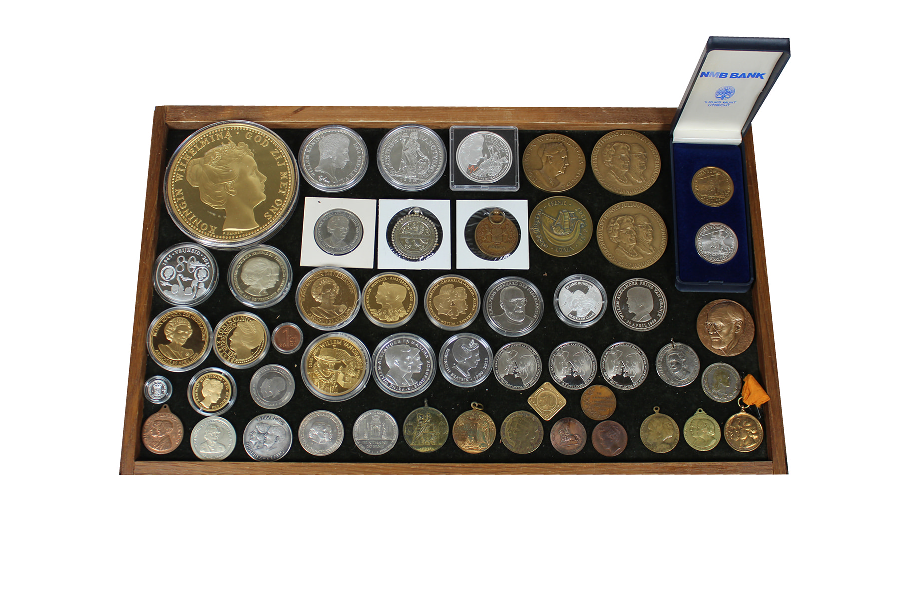 Sigarenkistje diverse oranjepenningen, w.o. mooie replica gouden tientje 1898 (Ø 90 mm., >400 gram).