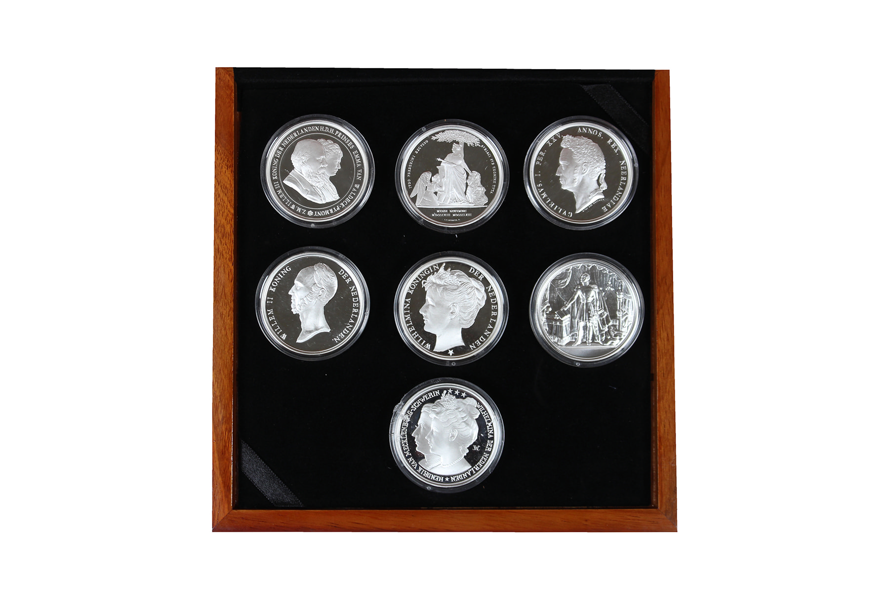 Kistje met 7 stuks sterling zilveren penningen uitgegeven door de KNM. Ca. 300 gram bruto. Proof.