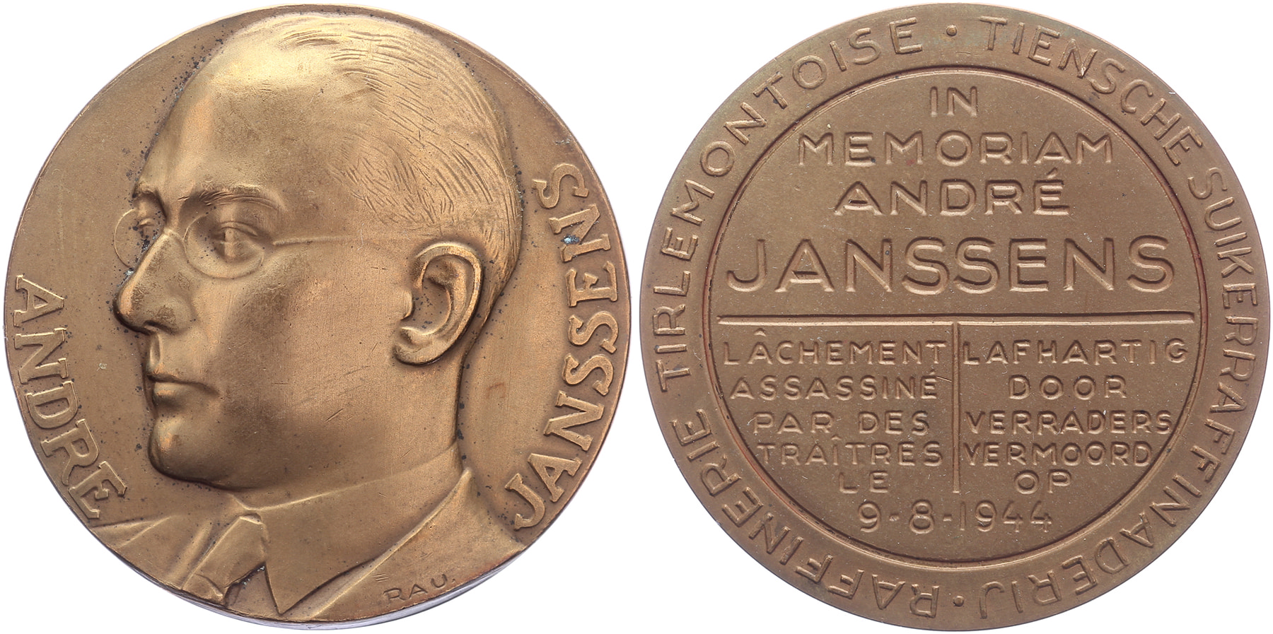 1944 Moord op André Janssens, directeur Tiensche Suikerraffinaderij, op 9 augustus.Hoofd André naar links. / Op- en omschrift. Æ 50. André Rau. Prachtig.