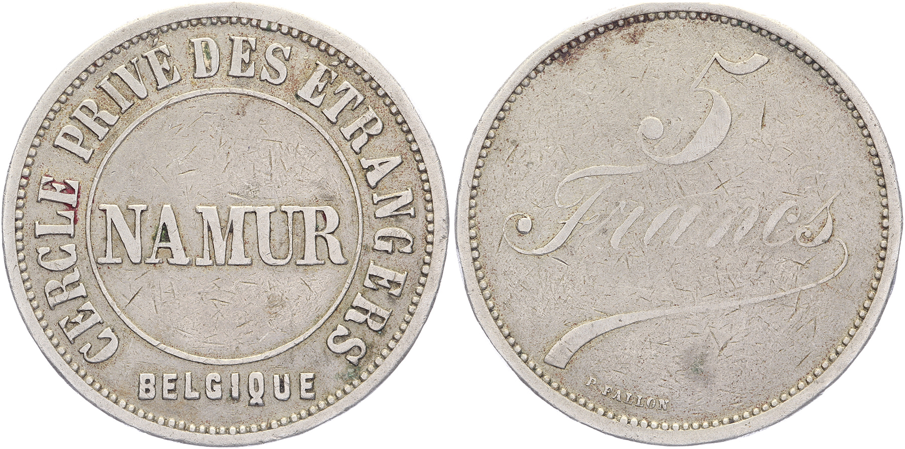 z.j. Namur (Namen). Token ‘Cercle Privé des Étrangers’. Op- en omschrift. / Fictieve waarde van 5 Francs. Cu/Ni 37 gladde rand. P. Fallon. Fraai / zeer fraai.