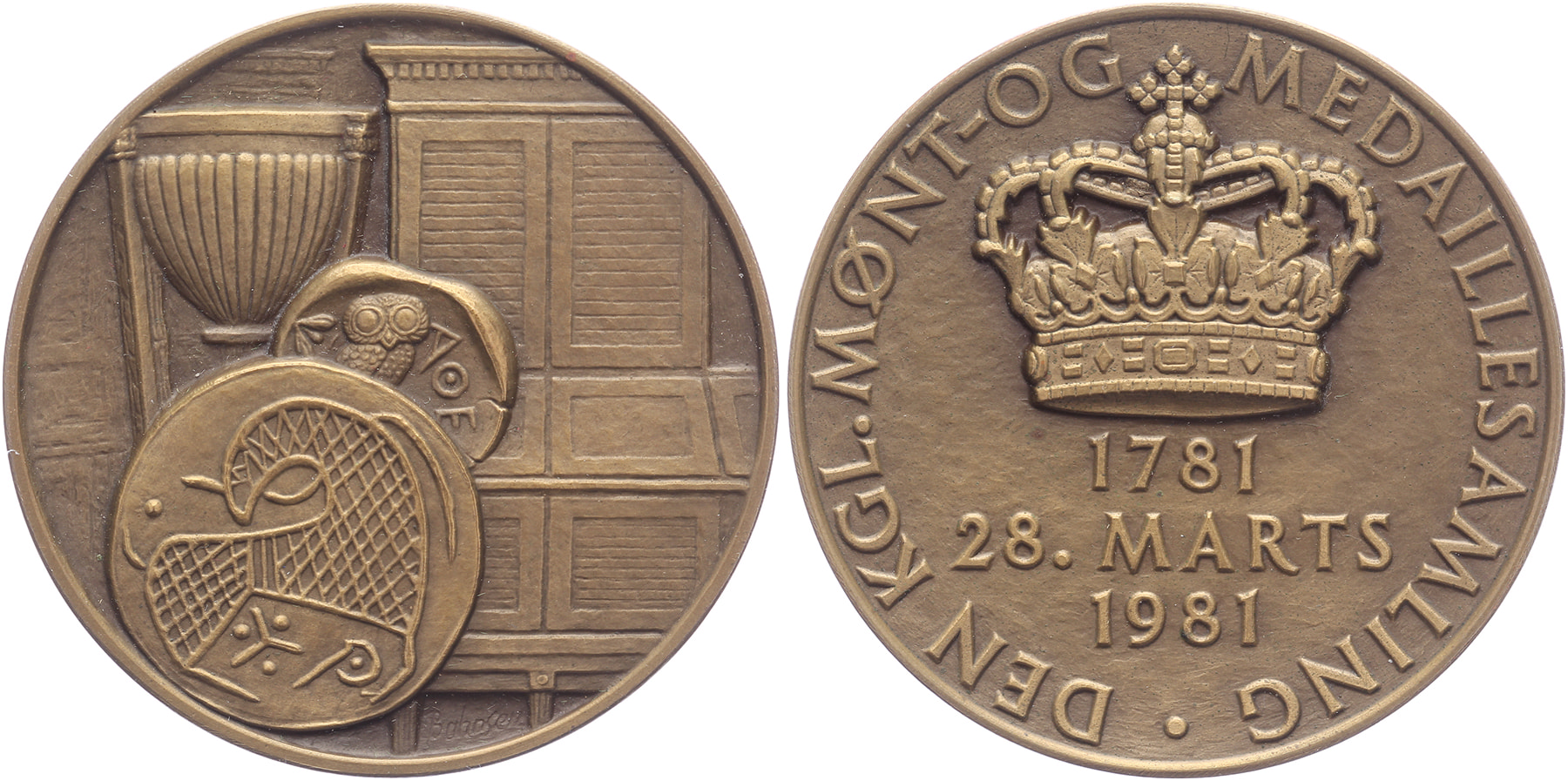 1981 Bicentenary medal collection Royal Mint. Ancient coins and coin cabinet. / Royal Danish crown and text. Æ48. Bahnsen. EF.