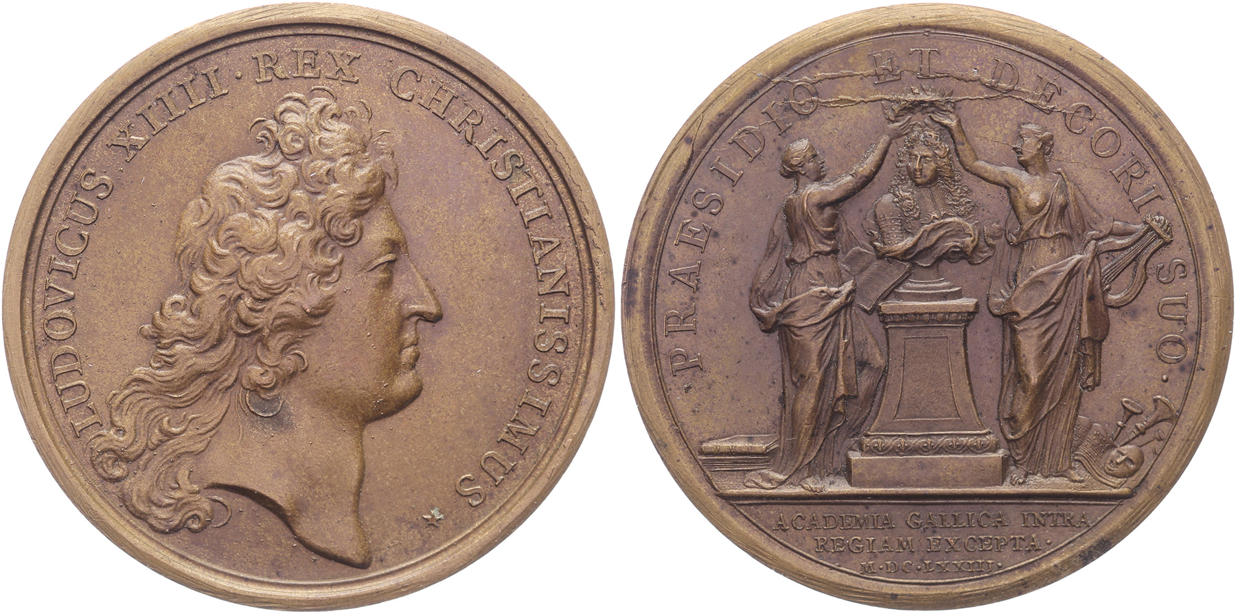 1673 L’Académie Française au Louvre. Head Louis XIV right. / Standing History and Poetry crowning bust of Louis XIV. Æ41. Later work, 19th century. Usual die break. VF. ⁂