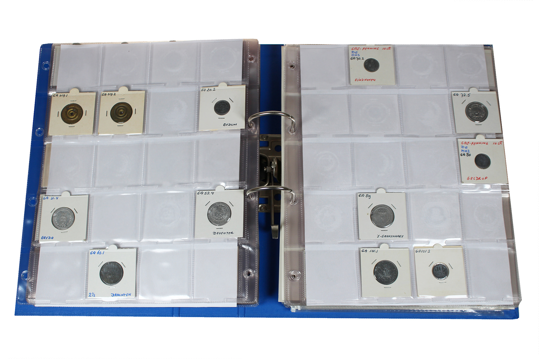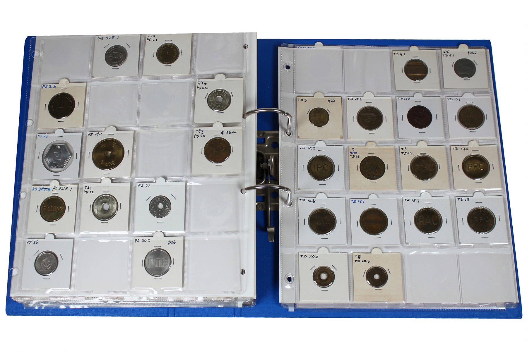 Blauwe ordner met ca. 230 stuks tokens en penningen allerlei, gas, water, licht, consumpties etc. Zeer divers!