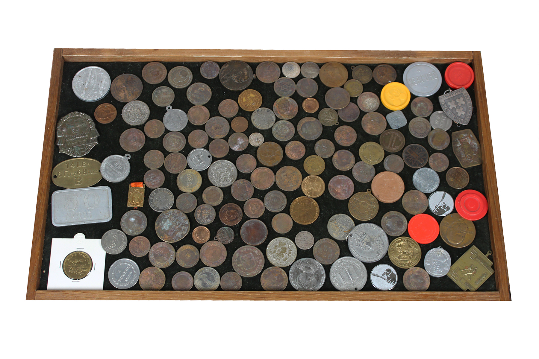 Blikje met groot aantal o.a. oudere tokens en medailles.