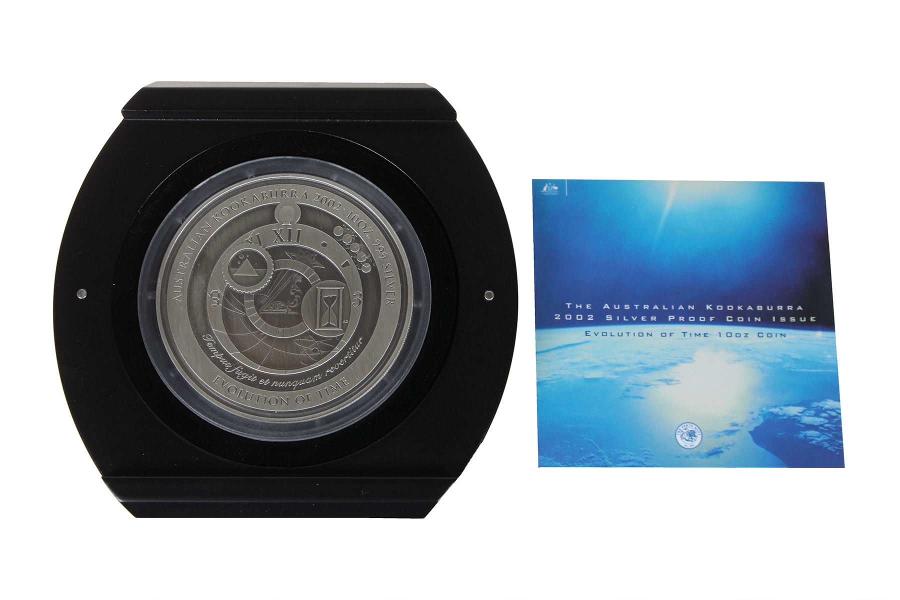 10 Dollars 2002 ‘Evolution of Time’, 10 oz. silver [311 gr.]. KM 633. Original packing. Proof.