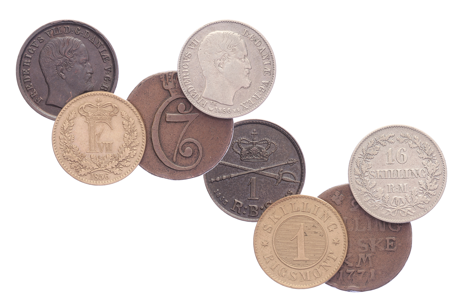 Lot (4) Rigsbankskilling 1853 (KM 756, EF); Skilling Rigsmont 1856 (KM 763, EF); 16 Skilling Rigsmont 1856 (reeded edge, KM 765, fine). Added: ½ Skilling 1771 Christian VII.