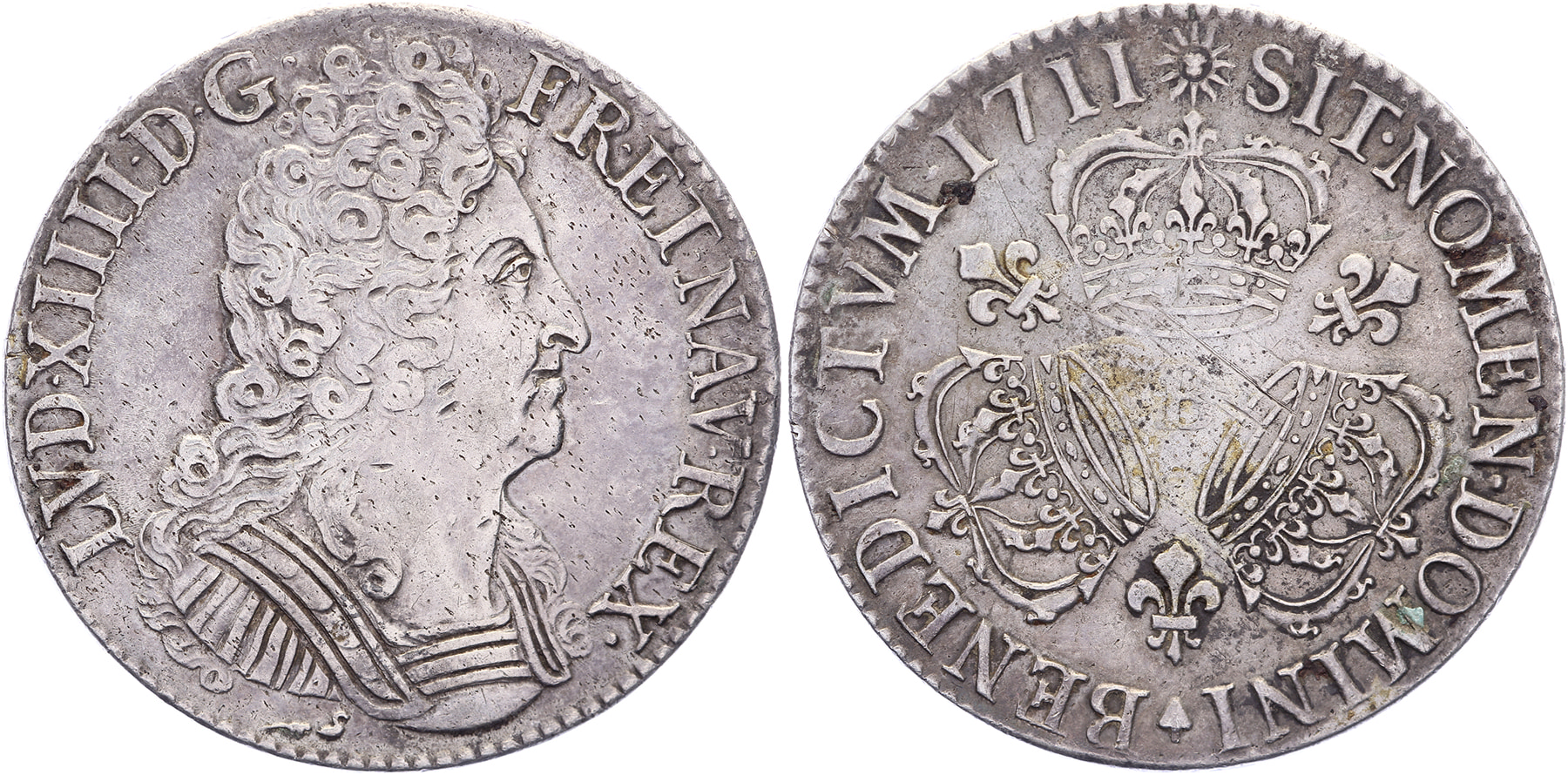 Écu 1711B (Rouen). Gad. 229; Dupl. 1568; KM 386.2. Near VF. ⁂
