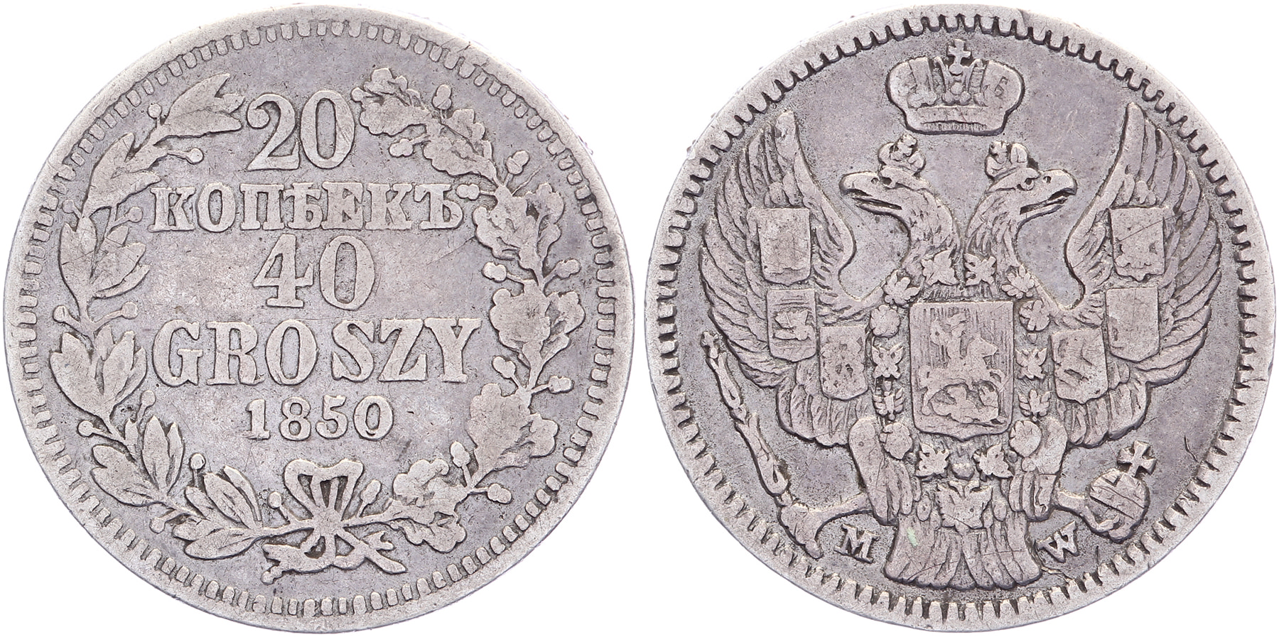 40 Groszy – 20 Kopeks 1850. Gum. 2545; KM C130. VF.