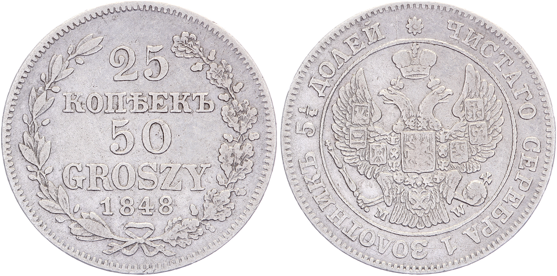 50 Groszy – 25 Kopeks 1848. Gum. 2546; KM C131. VF.