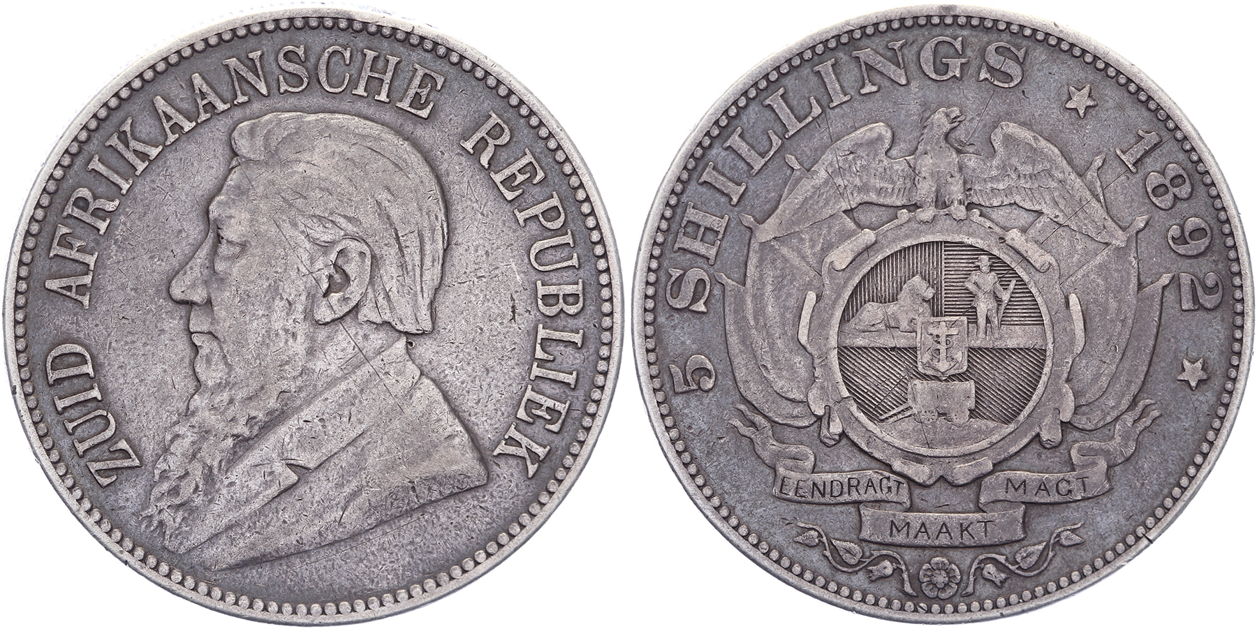 5 Shillings 1892 Paul Kruger, double shaft. KM. 8.2. Near VF.