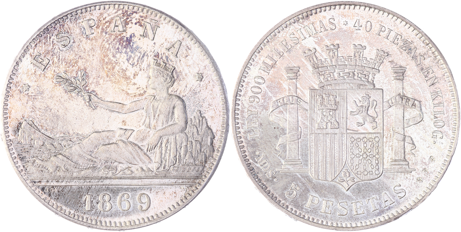 5 Pesetas 1869. Official numbered restrike. Edge: SOBERANIA NACIONAL (KM 655). Unc.