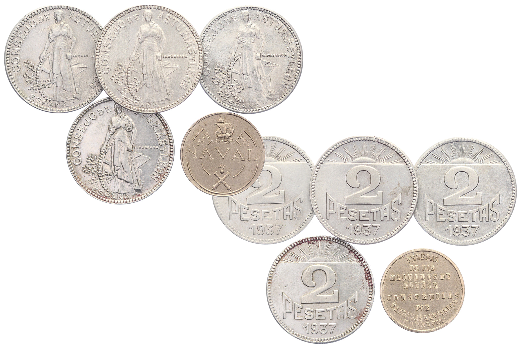 Lot (5) 2 Pesetas 1937. Four different varieties! CC 17696, 17697, 17698 & ??. Extensive description with lot. Added: peseta 1948 Naval (design Peseta?). EF.