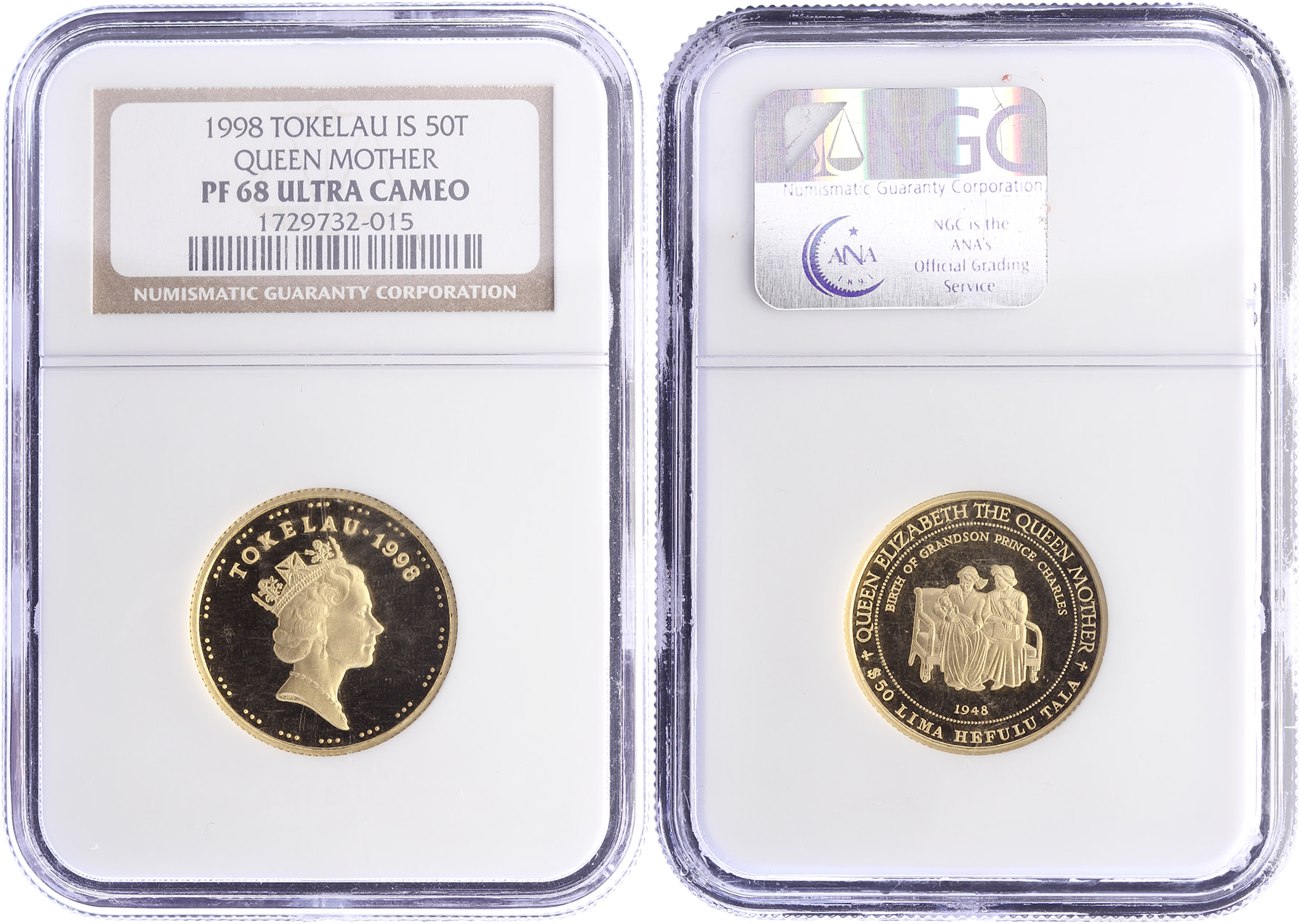 50 Dollars Lima Hefulu Tala 1998. 50th Birthday of Prins Charles. Fr. 2; KM 44. Slabbed by NGC. PF 68 Ultracameo.