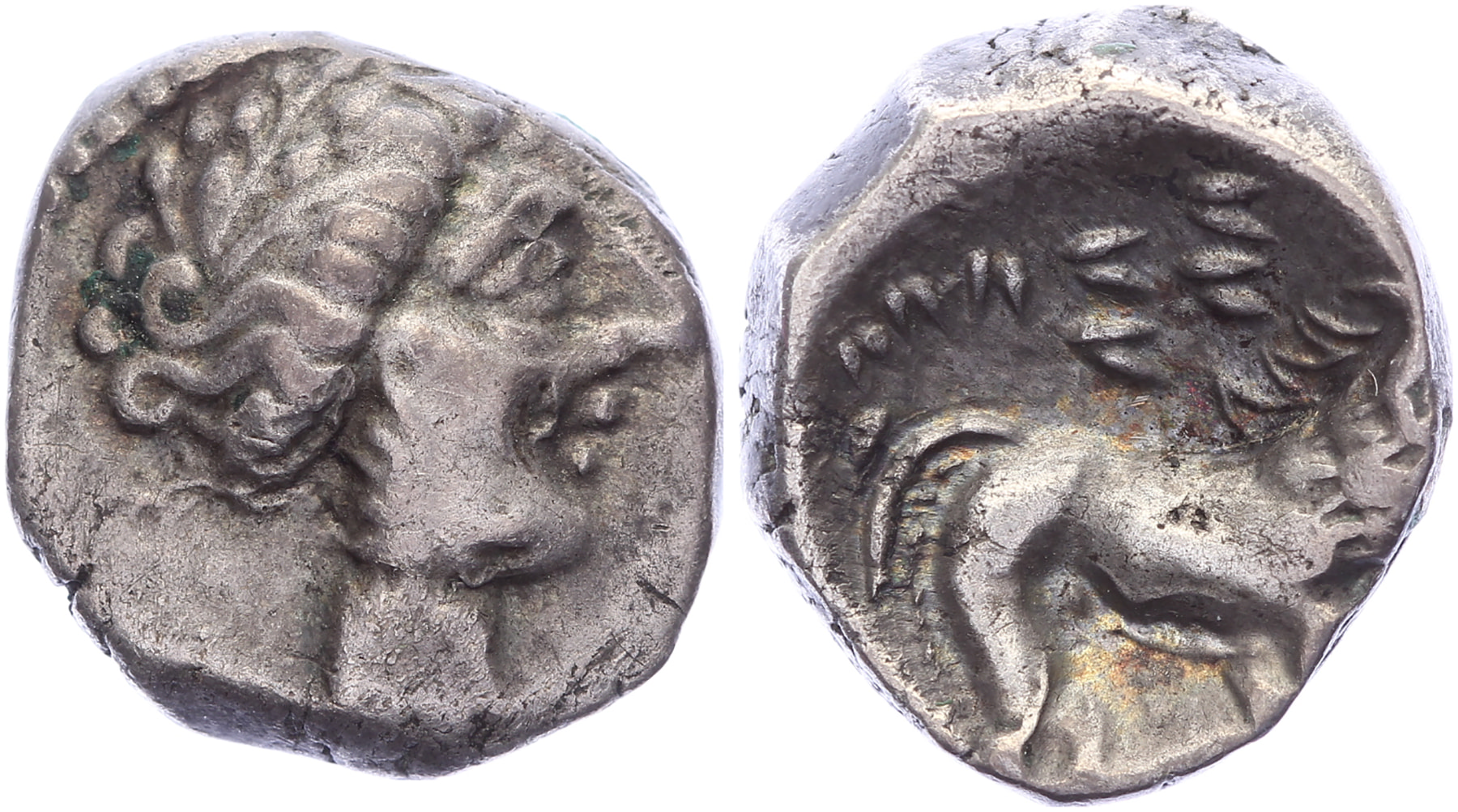 Circa 200-150 BC. AR Drachm [13,38 mm; 3,03 gm]. Imitation of Massalia. Head of Artemis right / Lion standing right, MAΣΣ above. De La Tour 2126, Pautasso 391-410. Reverse off centre, toned VF.