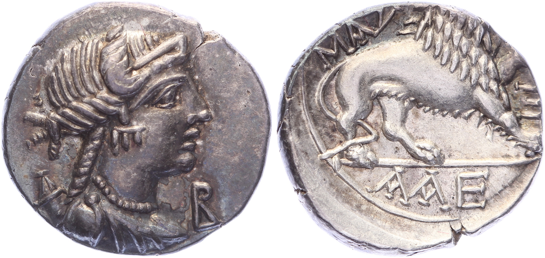 Circa 90-49 BC. AR Drachm [15,95 mm; 2,64 gm]. Draped bust of Artemis right, wearing stephane, bow and quiver over shoulder; B before / MAΣΣA, lion walking right; Ξ before; AAE in exergue. LT 1436; BN 1434-1437; Sch/L100. Reverse off centre, toned gVF.