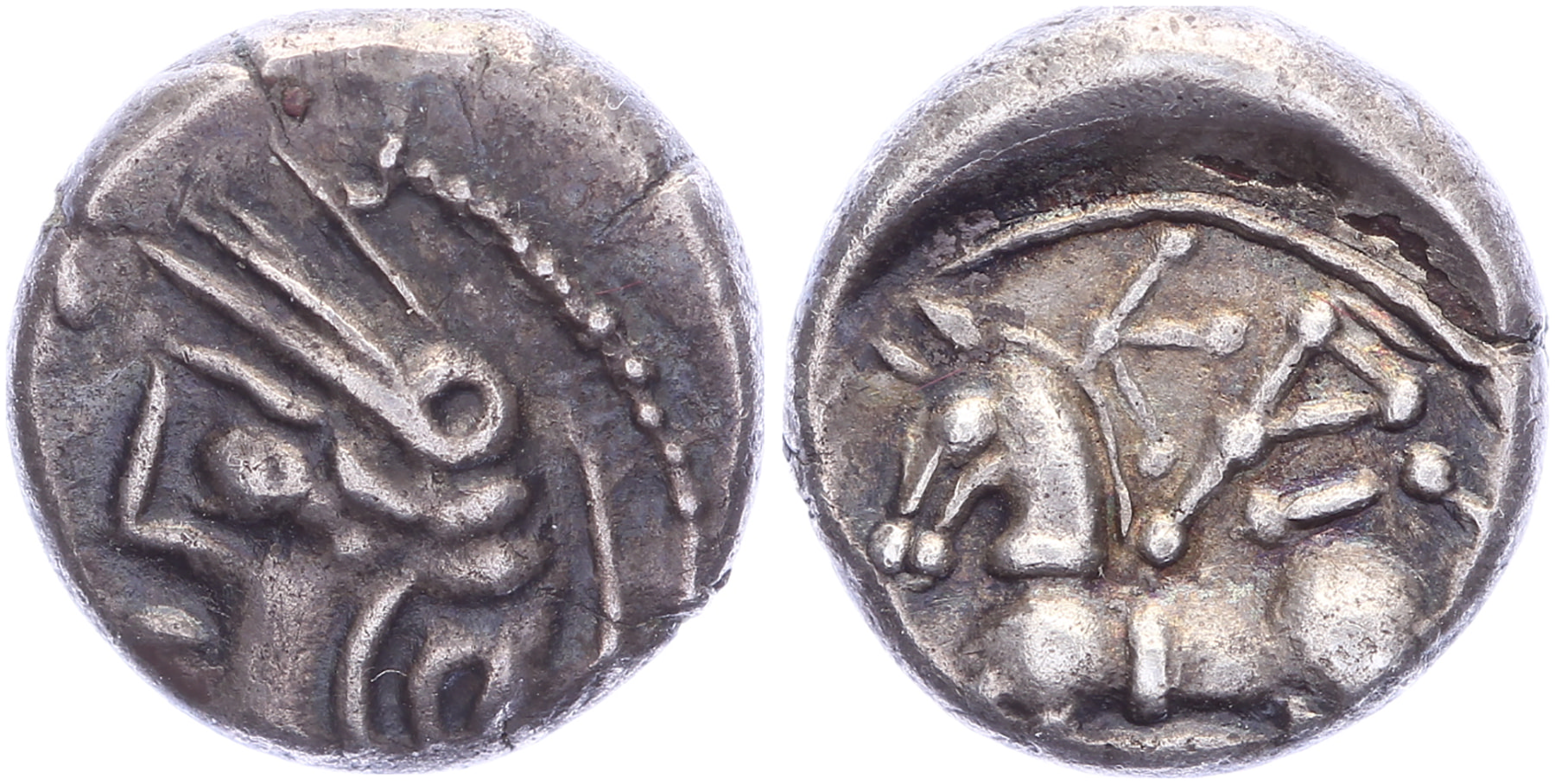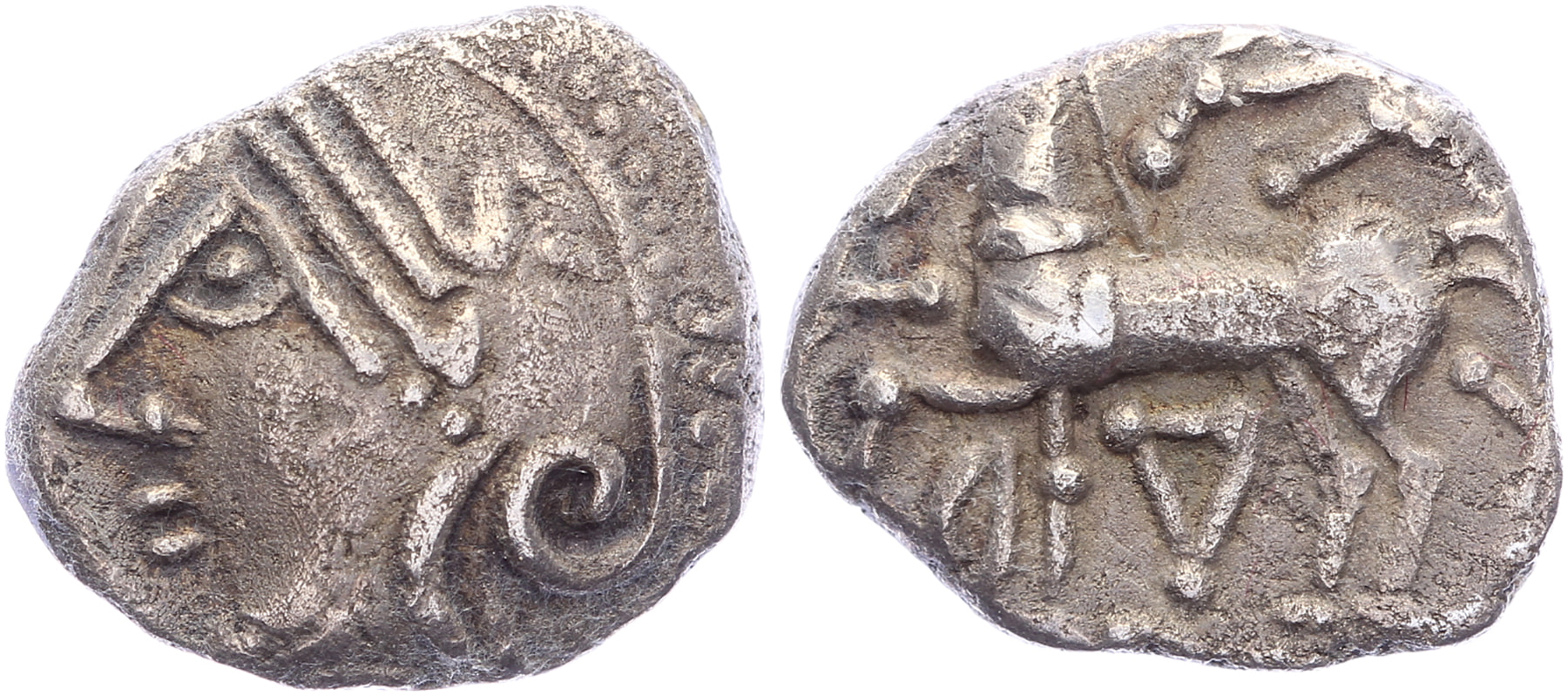 Lot (2) Circa 80-50 BC. Plated Quinarius [11,68 mm; 1,52 gm]; AR Quinarius [13,05 mm; 1,90 gm]. Helmeted head of Roma to left / Horse prancing left; KAΛ above, [ЄΔ] below, and [Y] to left. BMC 319 ff.; DLT 8178. VF/gVF.