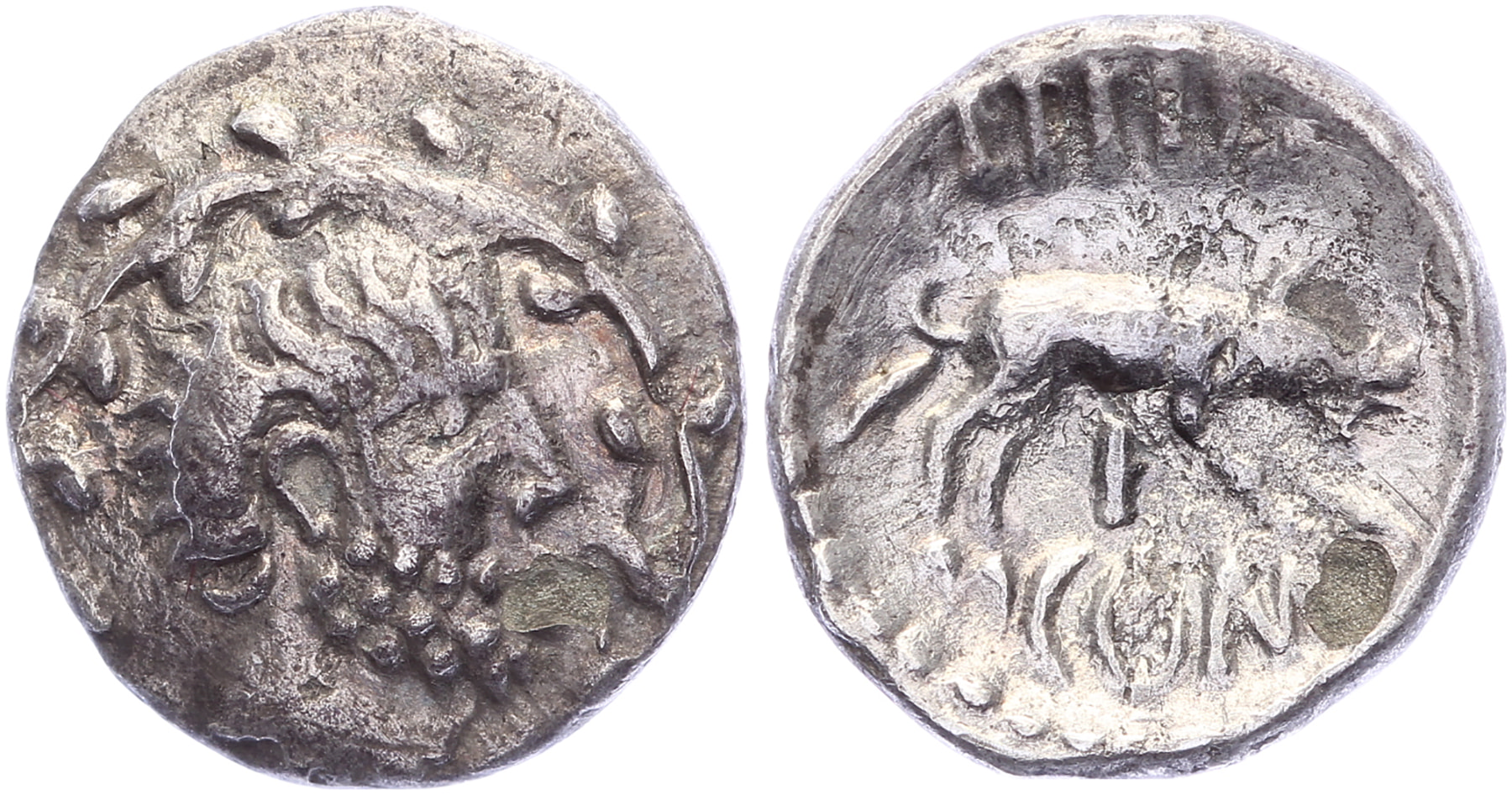 Eppillus. Circa 10 BC-10 AD. AR Unit [12,70 mm; 0,74 gm]. Bearded head right within wreath / EPPIL COM F, boar charging right. Hobbs 1061; Van Arsdell 416-1; SCBC 100. Rough in areas, VF.