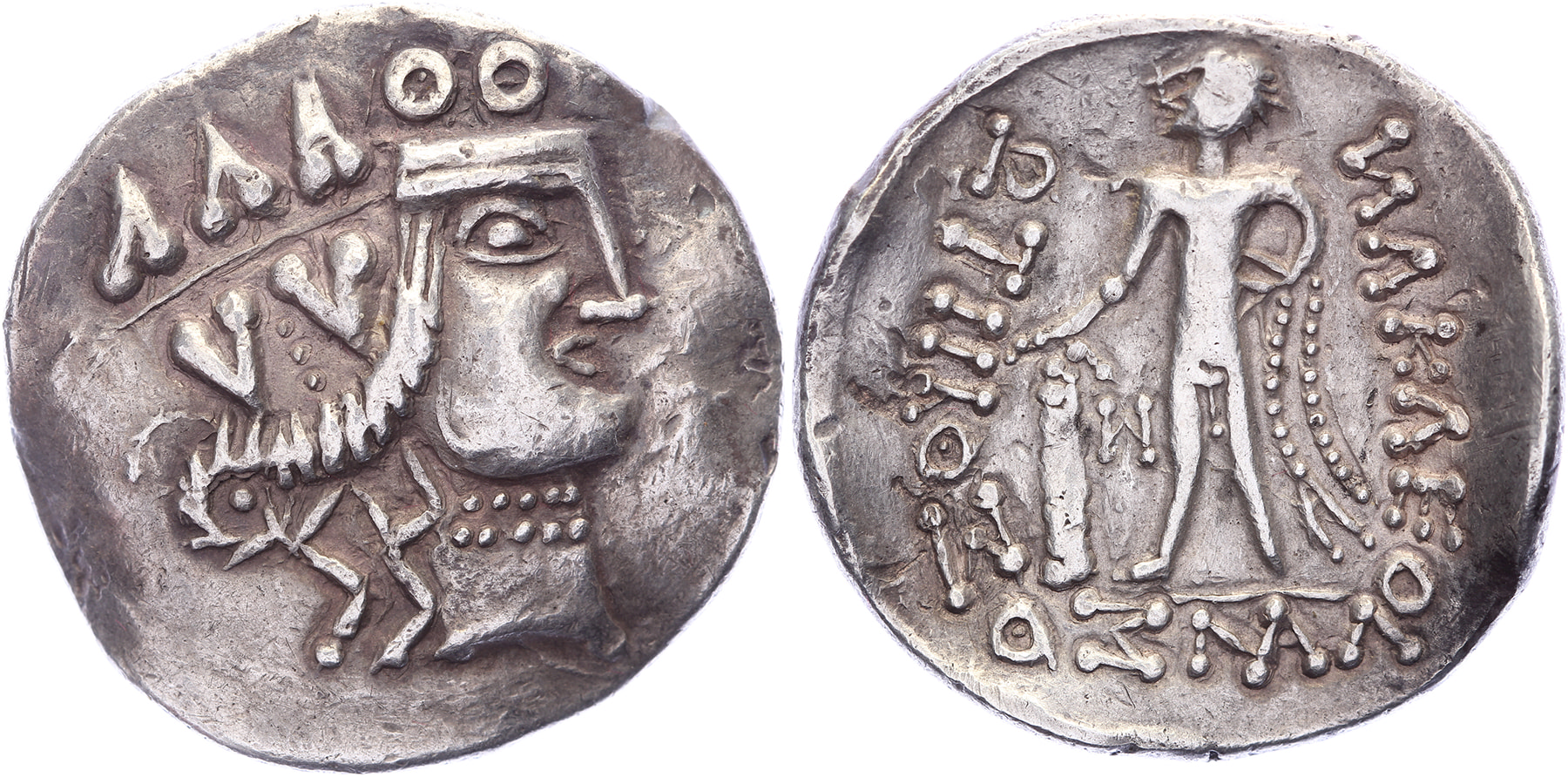 Circa 1st Century BC. AR Tetradrachm [31,96 mm; 16,08 gm]. Wreathed head of Dionysos right, style highly degraded / Blundered legend, Herakles standing facing, head right, holding club and lion’s skin; legend degraded to dots. Göbl, OTA Class IV. Some marks, a it wavy, toned gVF.