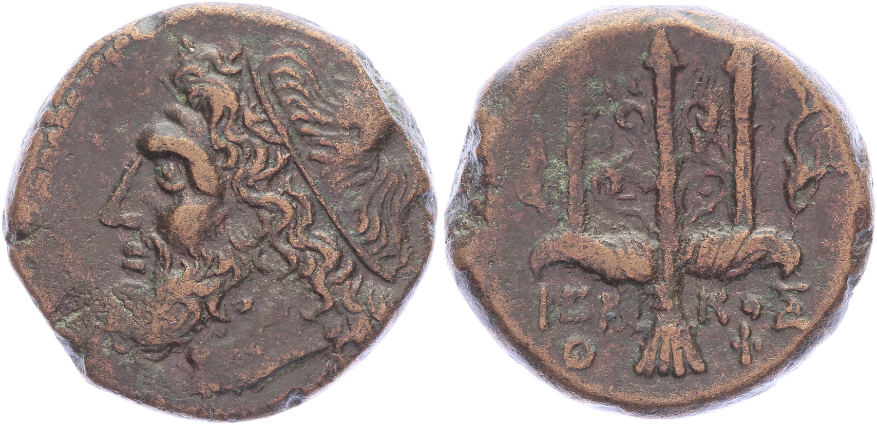 AE [18,63 mm; 6,42 gm]. Diademed head of Poseidon to left / Ornate trident head flanked by two dolphins swimming downwards; IEPΩ-NOΣ across fields, Θ-Φ flanking base. HGC 1550. VF.
