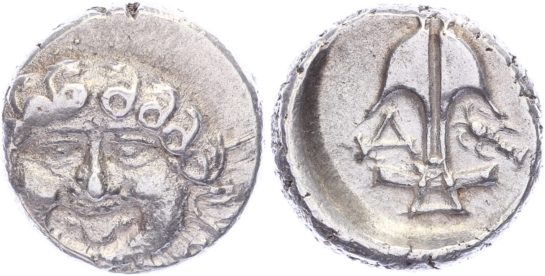Late 5th-4th centuries BC. AR Drachm [13,16 mm; 2,86 gm]. Facing gorgoneion; spiral ornament / Upright anchor; crayfish to right, A to right. SNG BM Black Sea 160-1; SNG Copenhagen 457. Off centre, VF.