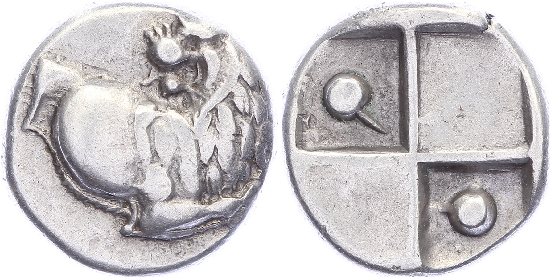 Circa 350-330 BC. AR Hemidrachm [12,44 mm; 2,35 gm]. Forepart of lion right, looking back, right foreleg raised / Quadripartite incuse, two pellets in fields. Grose pl. 148, 2. VF.