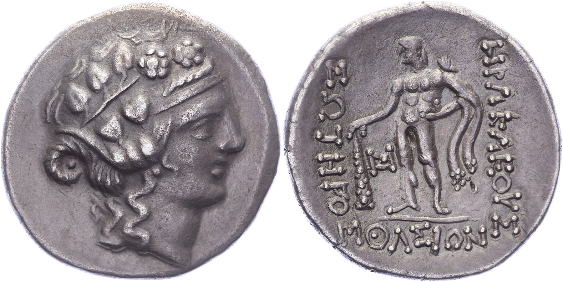 AR Tetradrachm [31,53 mm; 16,35 gm]. Head Dionysus right / HΡAKΛEOΥΣ ΣΩTHΙOΣ ΘΛΣIΩN, Hercules standing left, with lion skin cloak, holding club, monogram on inner left. SNG Copenhagen 1046, Le Rider 51. Minor test marks and scratches, toned gVF.