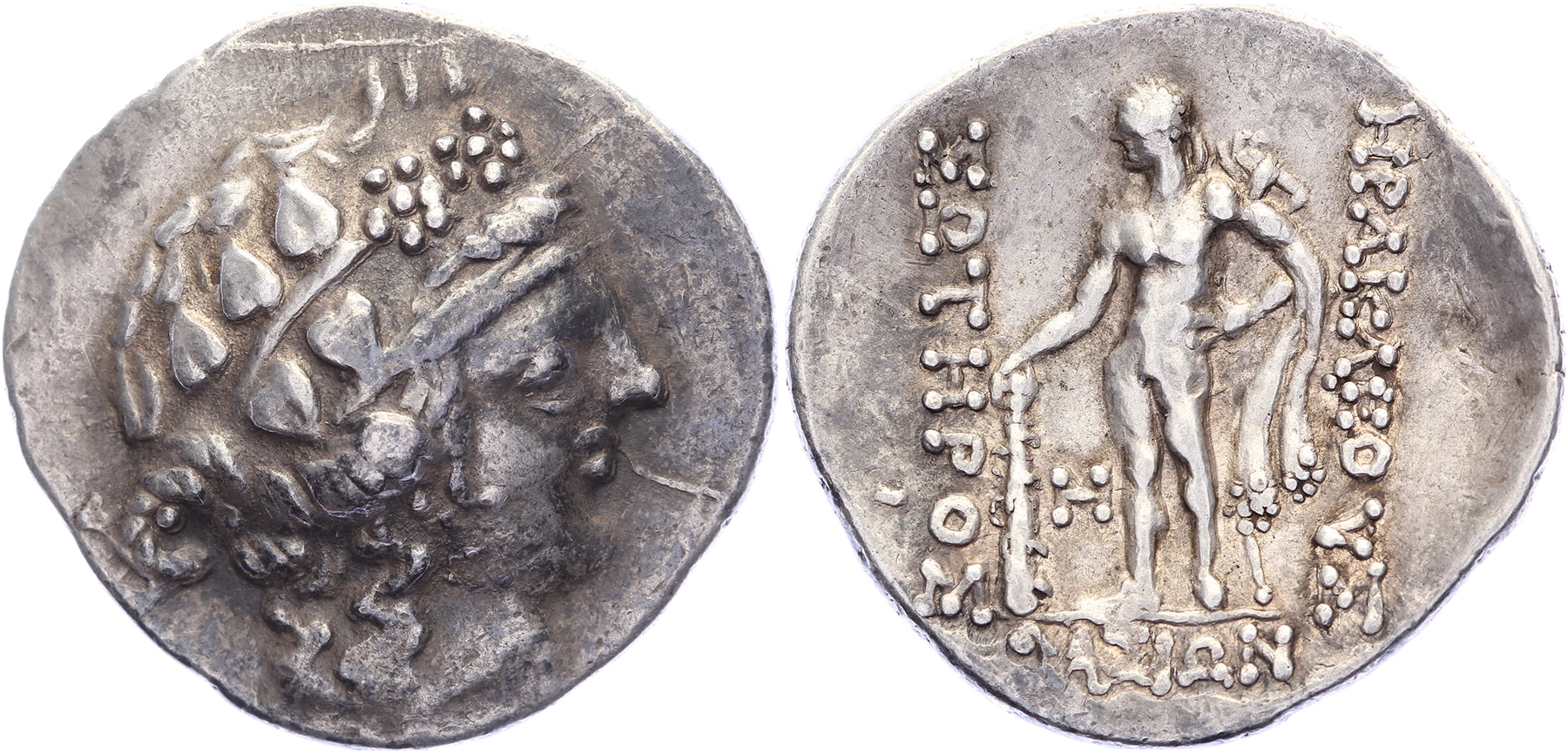 AR Tetradrachm [30,93 mm; 16,82 gm]. Head Dionysus right / HΡAKΛEOΥΣ ΣΩTHΙOΣ ΘΛΣIΩN, Hercules standing left, with lion skin cloak, holding club, H on inner left. Prokopov Thasos, Group XII, pl. 56, 763-768. Toned VF.